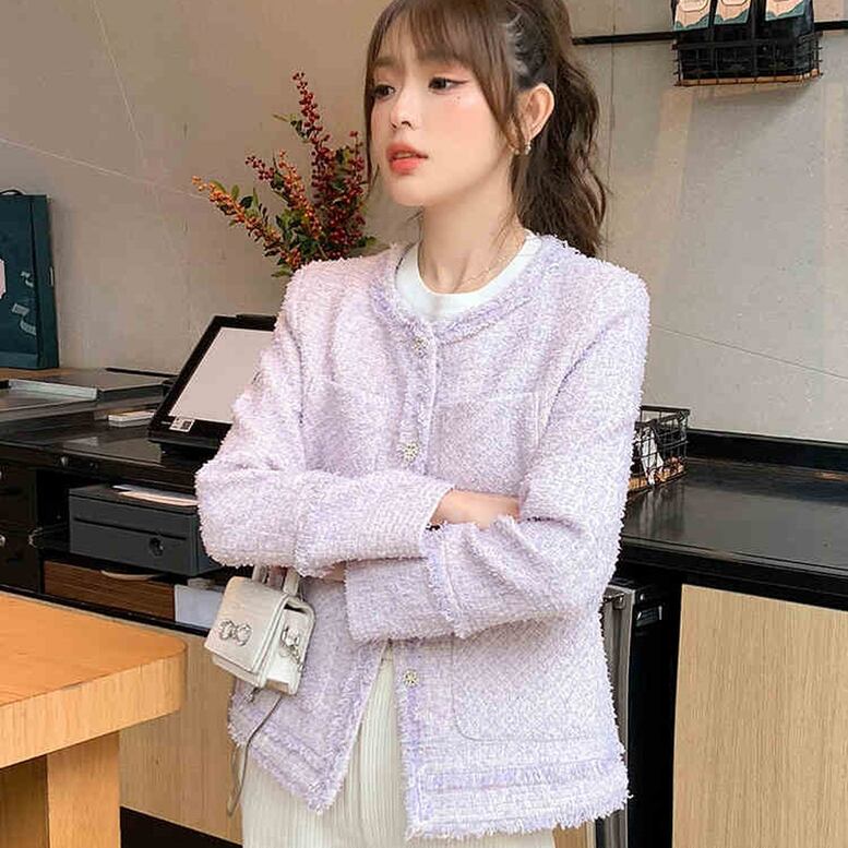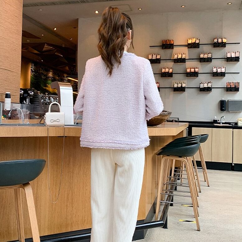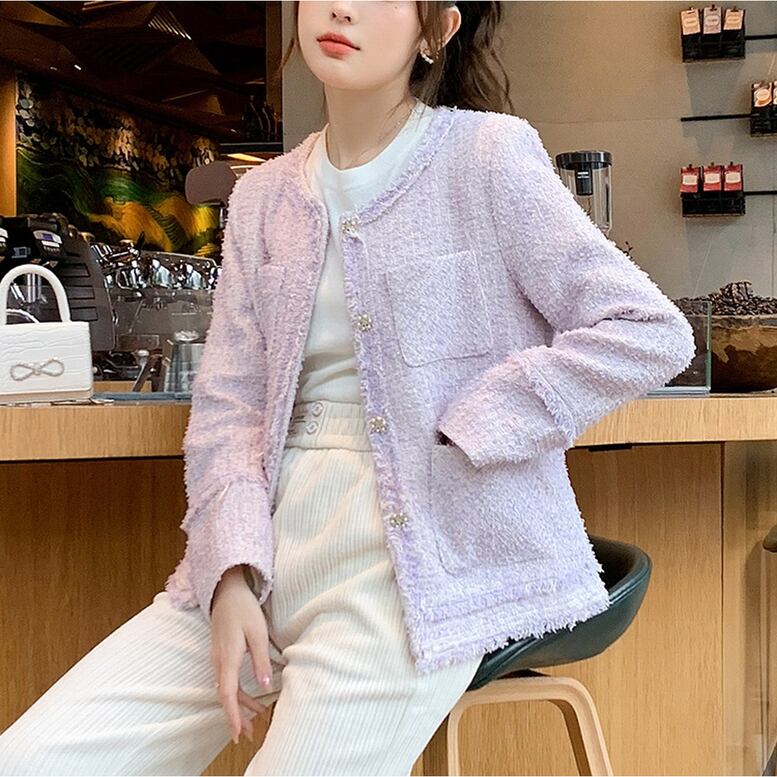ノーカラーツイードジャケット アウター レディース ジャケット ノーカラージャケット ツイードジャケット クルーネック フリンジジャケット ライトアウター ポケット スリム ラウンドネック 襟無し フェミニン 紫 パープル 大人可愛い きれいめ 上品 エレガント フォーマル ガーリー キュート レトロ 春 夏 秋 冬 二次会 お呼ばれ ビジネス オフィス OL 通勤 学生 通学 デート お出かけ パーティー イベント 女子会 休日 体型カバー モテ 普段使い 定番 トレンド ゆったり インスタ映え