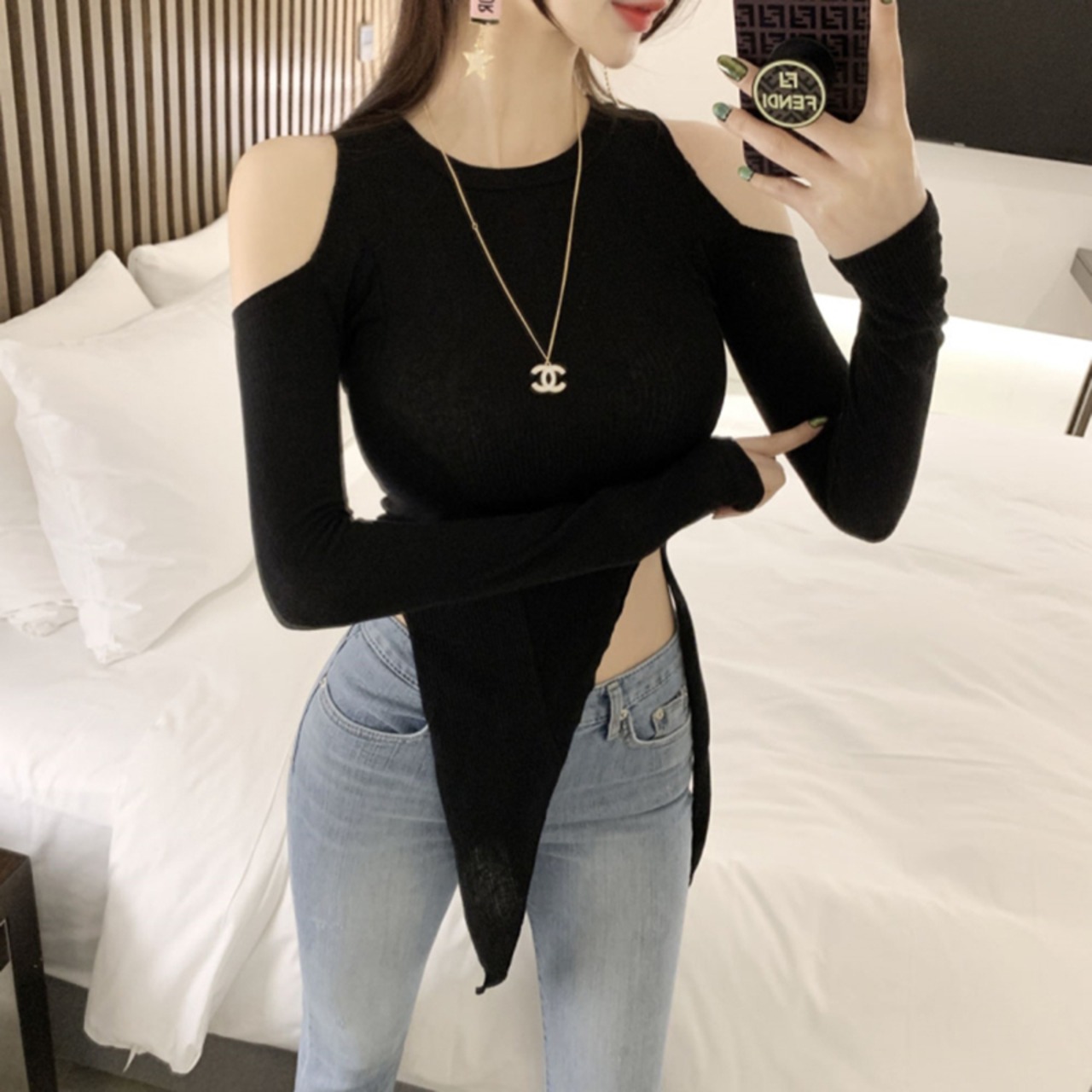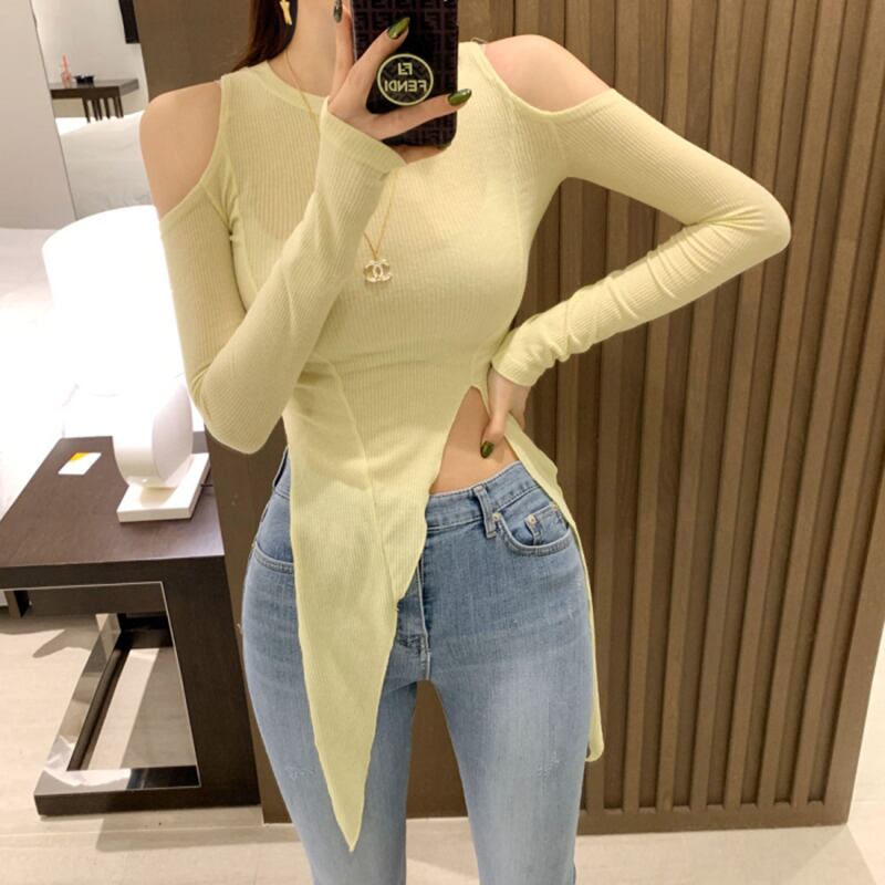 トップス カットソー 3色 オフショルダー アシンメトリー 長袖 レディース きれいめ セクシー エレガント 薄手 お洒落 オシャレ かわいい 大人可愛い 10代 20代 30代 40代 シンプル カジュアル 春 夏 秋 こなれ感 休日 お出かけ 買い物 女子会 デート モテ 韓国 トレンド 流行 柔らか 着心地 無地 ホワイト 白 イエロー 黄色 ブラック 黒 抜け感 華奢 体型カバー 着痩せ タイト スリム 細身 スリット 脚長 美脚 個性派 個性的 透け感 アームカバー アームウォーマー