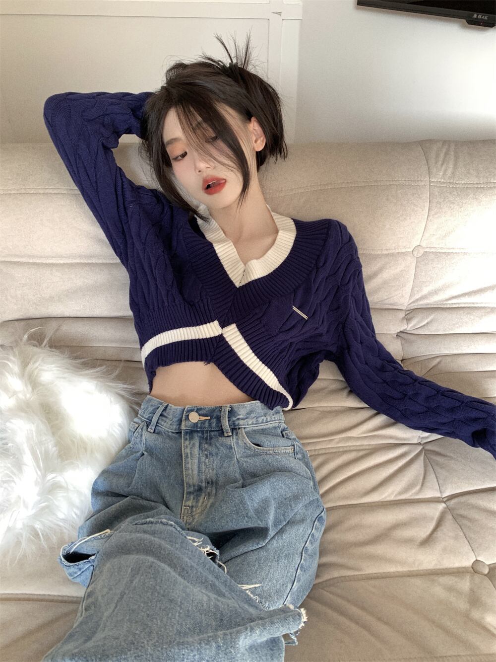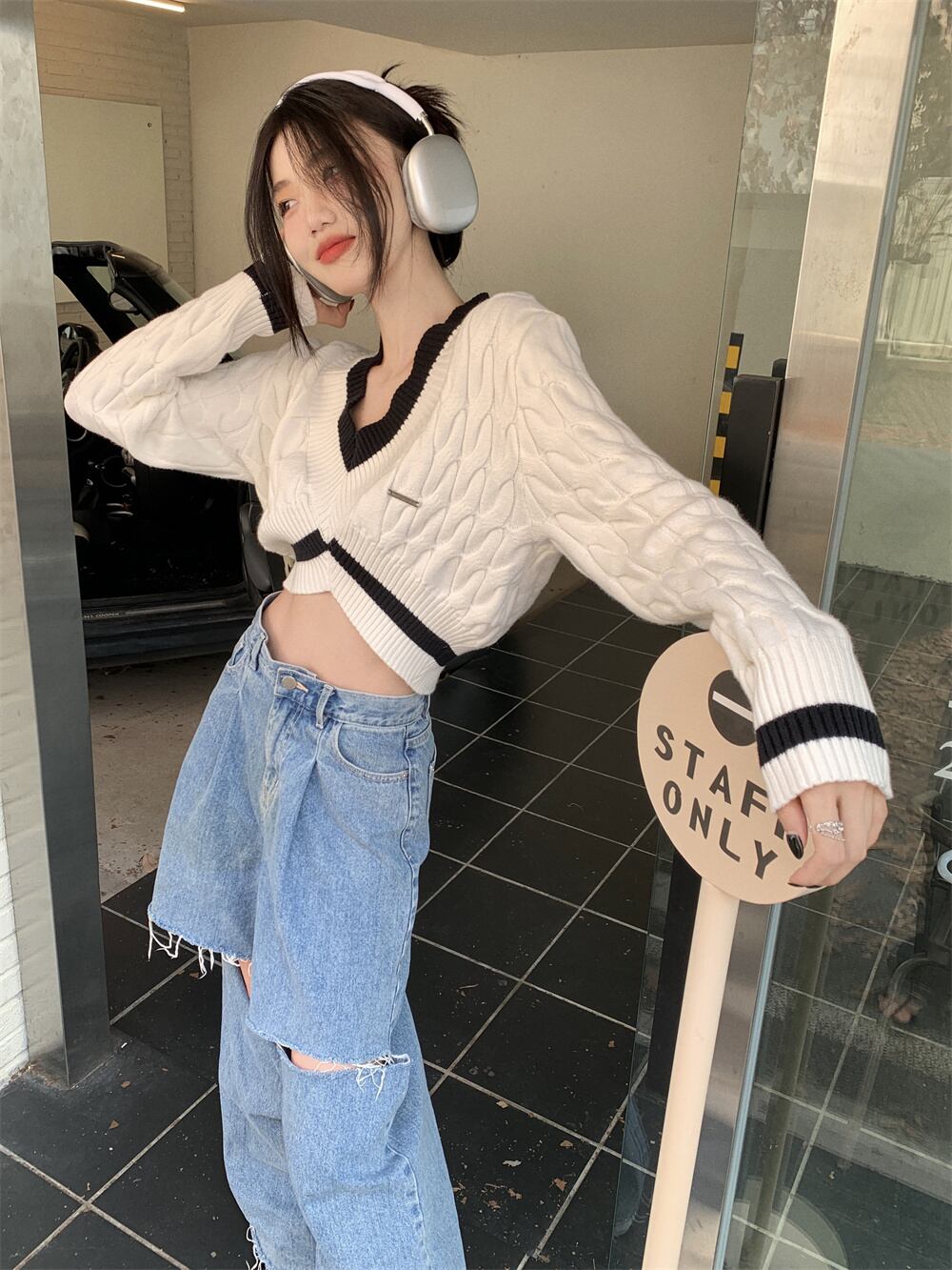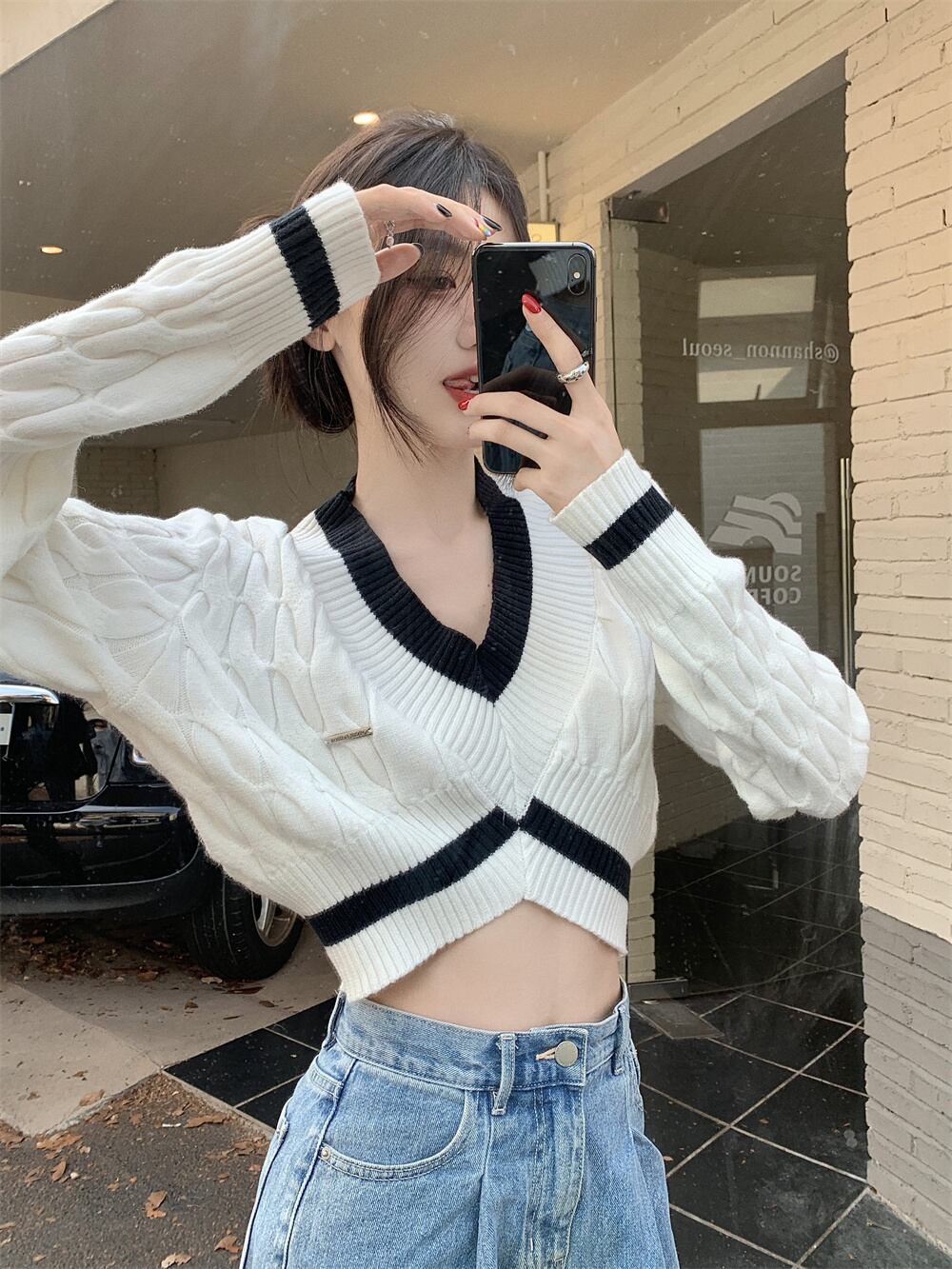 トップス ニット セーター 2色 バイカラー ショート丈 ゆったり 長袖 レディース シンプル カジュアル ラフ 白 ホワイト 紺 ネイビー タイト スリム 細身 萌え袖 休日 お出かけ 公園 体型カバー 着痩せ 細見え 10代 20代 30代 40代 春 秋 冬 お洒落 オシャレ かわいい 大人可愛い こなれ感 大きめ あったか 暖かい Vネック ガーリー レトロ アンティーク ヴィンテージ 映え SNS 女子会 デート モテ 脚長 美脚 スタイルアップ ライン リブニット