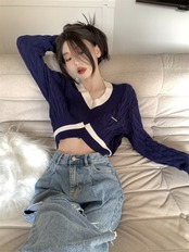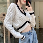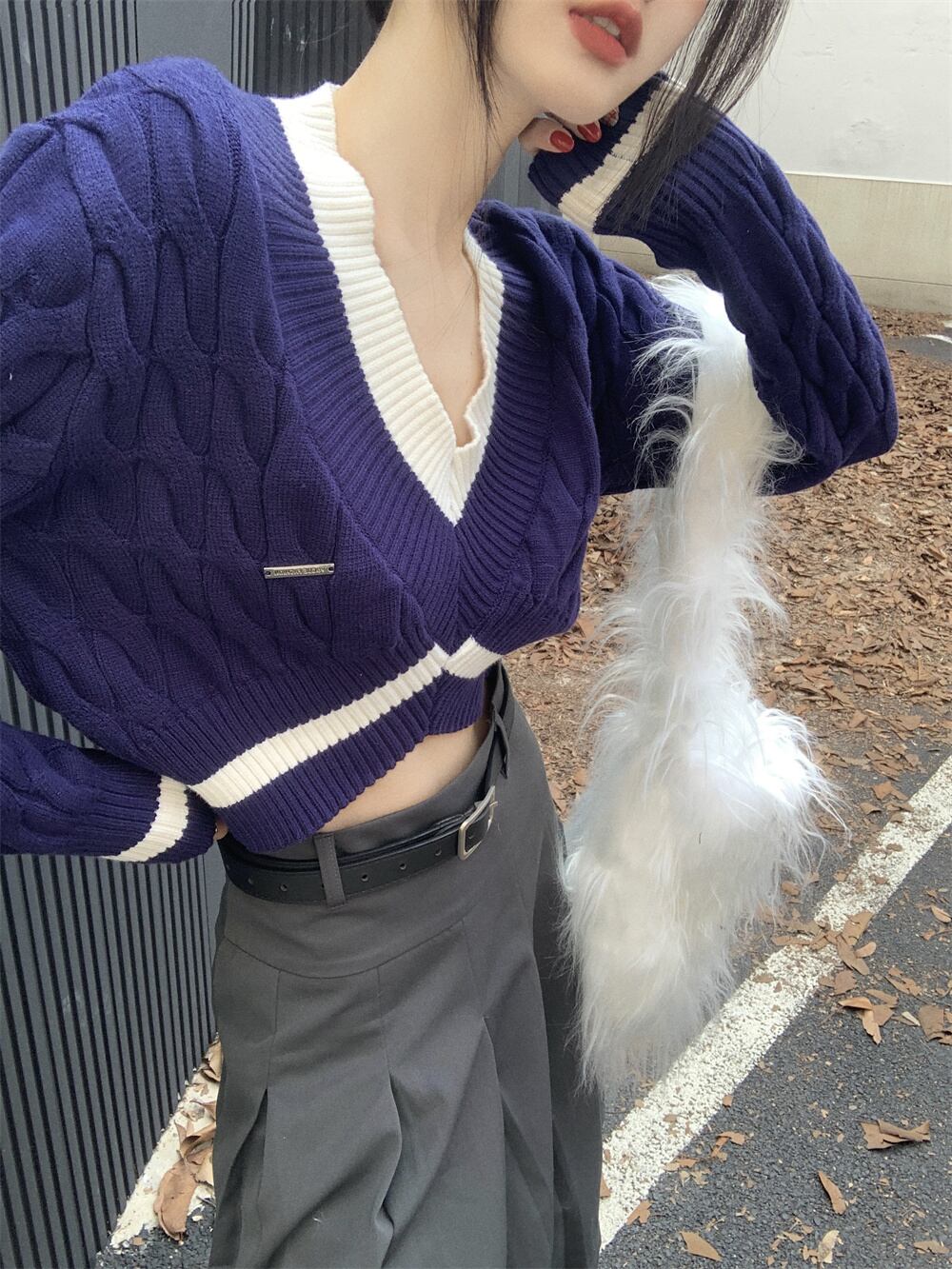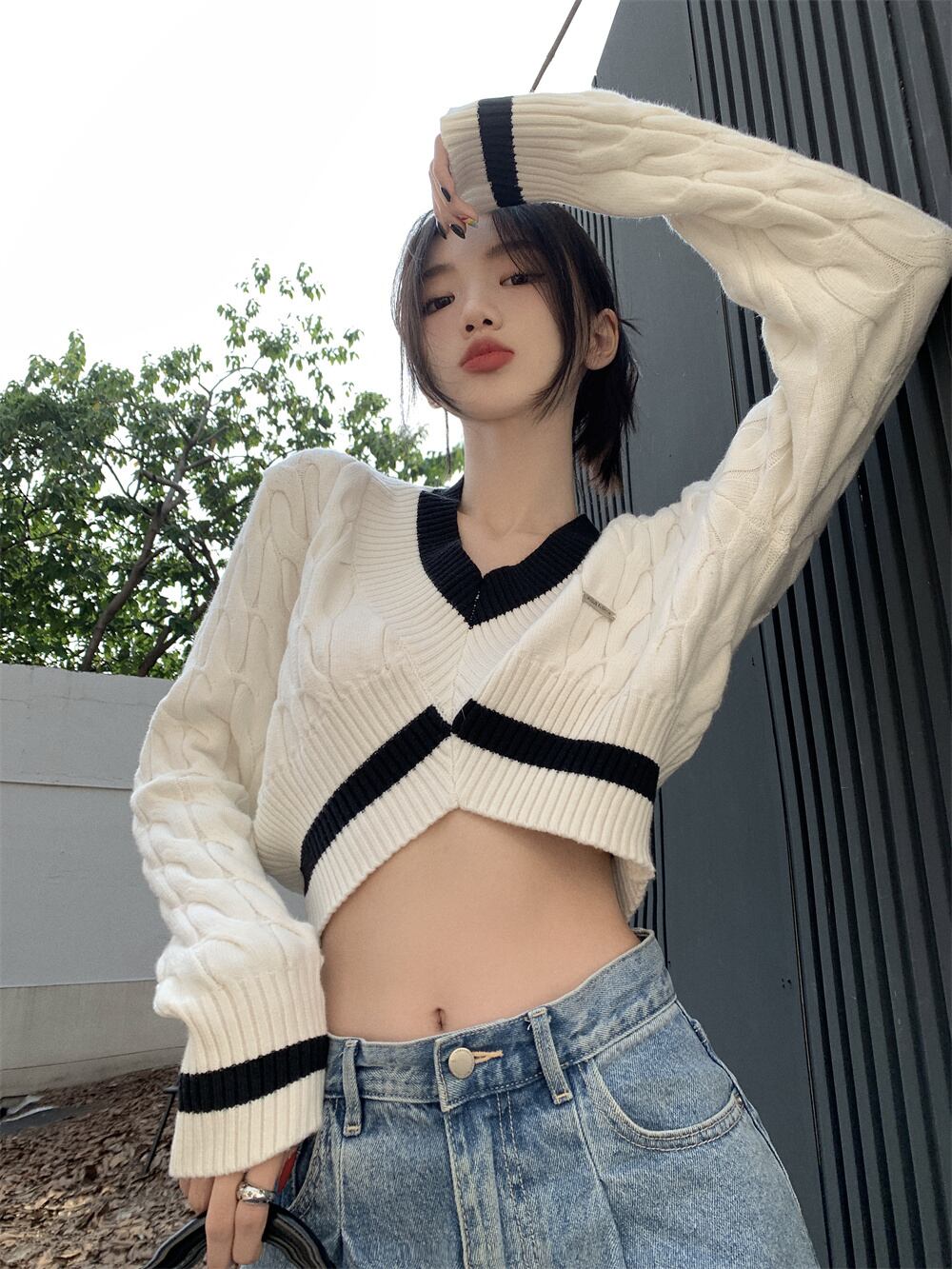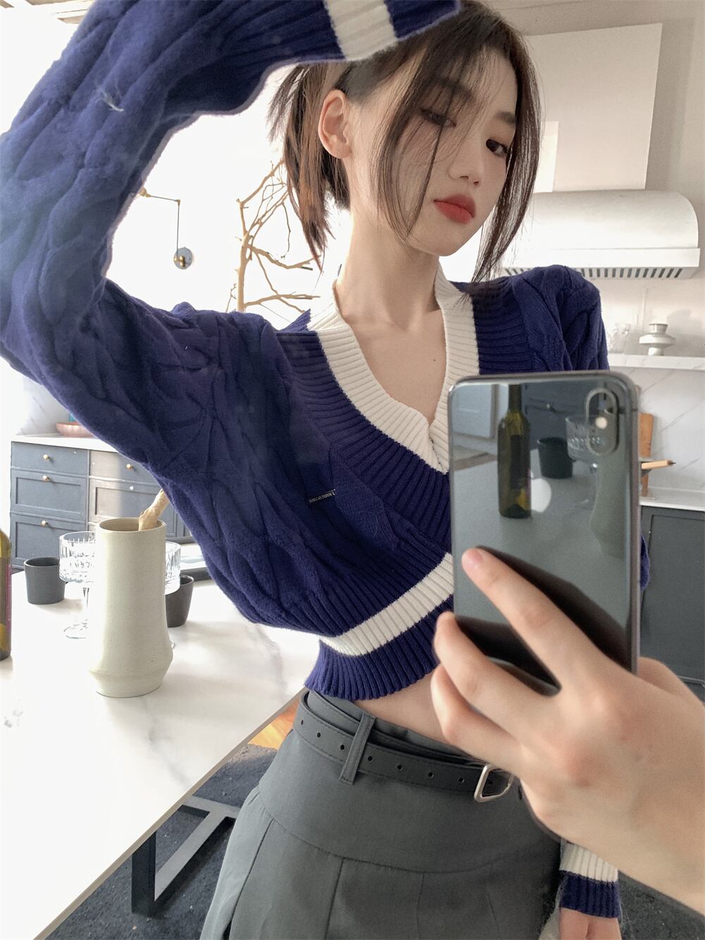 トップス ニット セーター 2色 バイカラー ショート丈 ゆったり 長袖 レディース シンプル カジュアル ラフ 白 ホワイト 紺 ネイビー タイト スリム 細身 萌え袖 休日 お出かけ 公園 体型カバー 着痩せ 細見え 10代 20代 30代 40代 春 秋 冬 お洒落 オシャレ かわいい 大人可愛い こなれ感 大きめ あったか 暖かい Vネック ガーリー レトロ アンティーク ヴィンテージ 映え SNS 女子会 デート モテ 脚長 美脚 スタイルアップ ライン リブニット