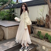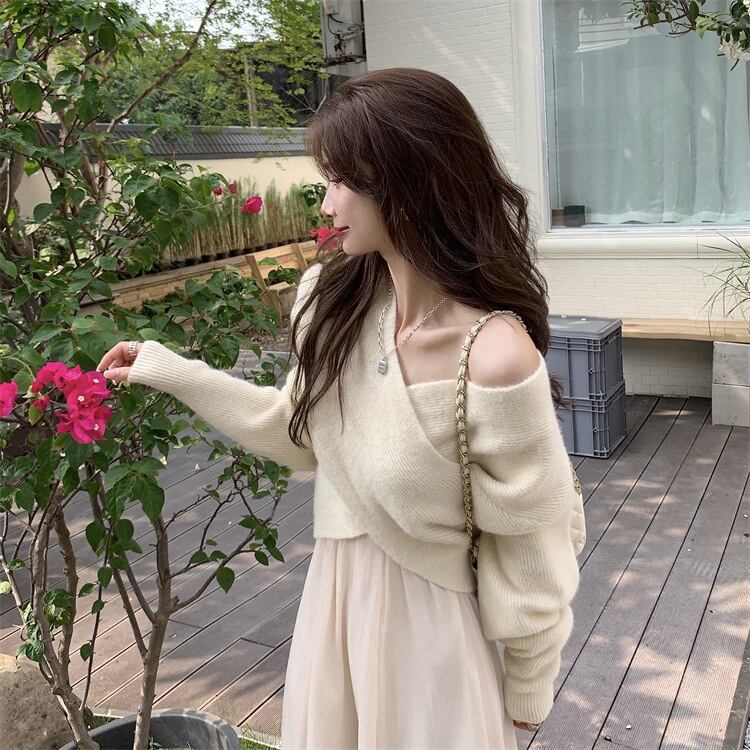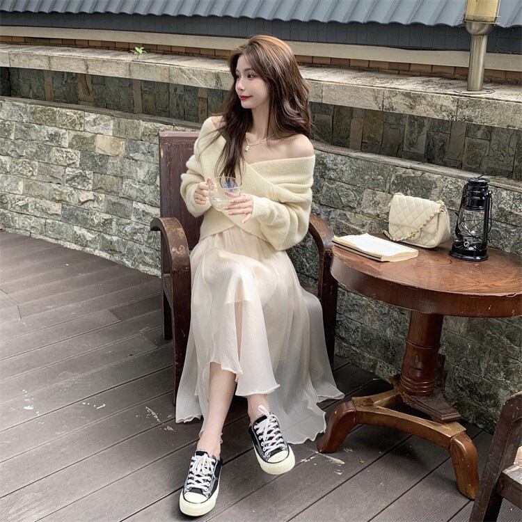 セットアップ 上下セット ニット ニットソー ロングスカート レディース ショート丈 クロスデザイン シフォン アシンメトリー オシャレ お洒落 かわいい 大人可愛い 上品 きれいめ エレガント 高級感 長袖 無地 ロング丈 ミモレ丈 ベージュ お得 お買い得 楽ちん S М L XL 着回し 春 秋 冬 カジュアル 脚長 美脚 体型カバー 着痩せ 20代 30代 40代 50代 Aライン Vネック 長袖 ゆったり ゆる ルーズ 透け感 オフショルダー
