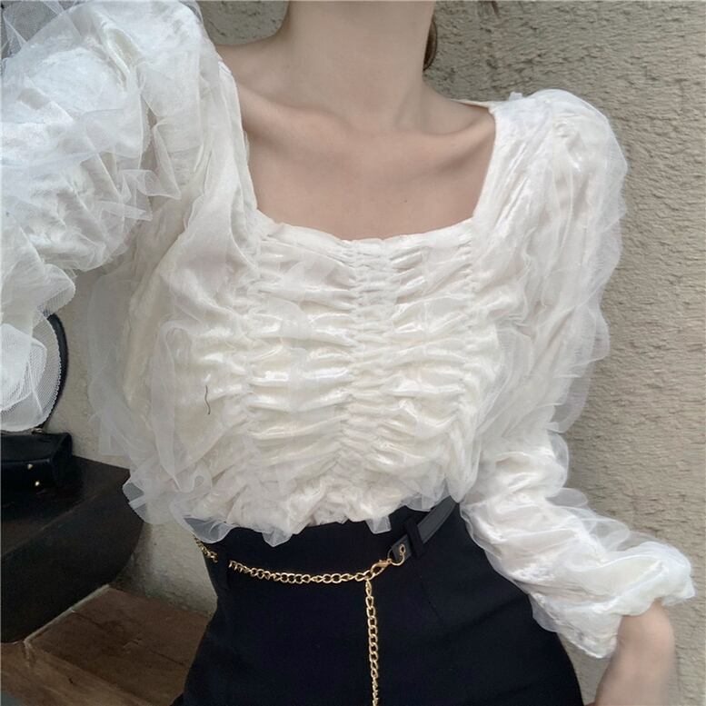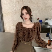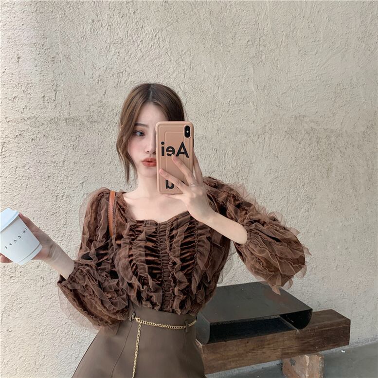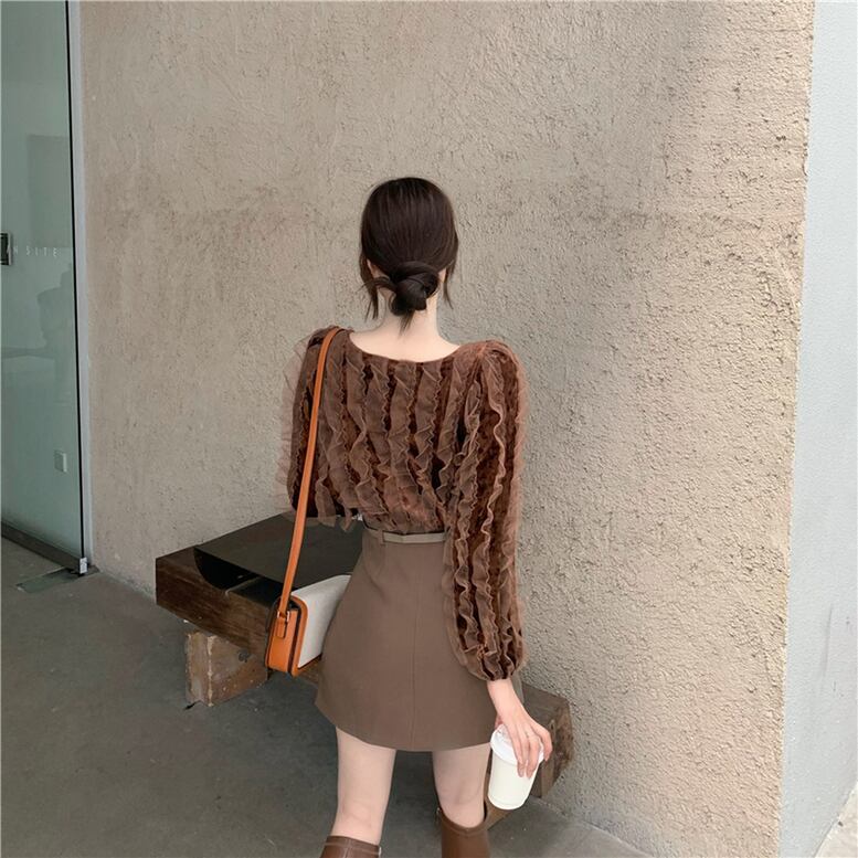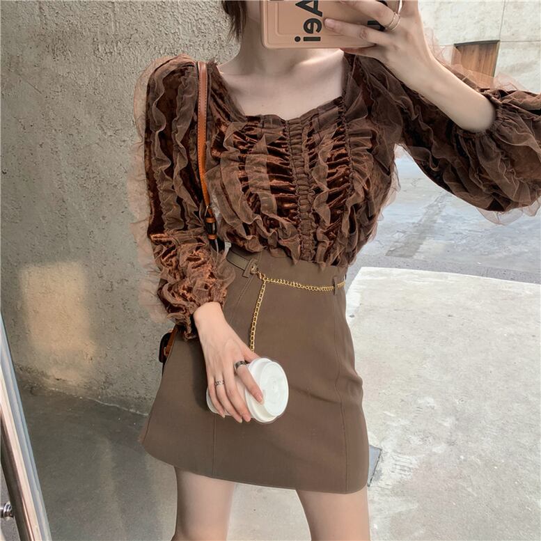 トップス ベロア&チュールMIXトップス レディース 異素材ドッキングトップス 切り替え ドッキングトップス ブラウス シャツ ラウンドネック 長袖 ベロア レース チュール フリル シャーリング バルーンスリーブ 茶色 白 ブラウン ホワイト 大人可愛い きれいめ 上品 エレガント ガーリー キュート レトロ 大人女子 おしゃれ 春 夏 秋 冬 二次会 オフィス OL 通勤 学生 通学 デート お出かけ パーティー イベント 女子会 休日 体型カバー 普段使い トレンド ゆったり インスタ映え