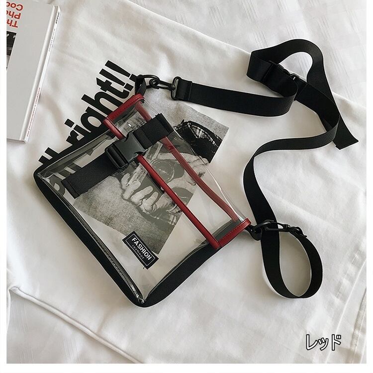 ショルダーバッグ 3色 クリアー 透明 スケルトン レディース ロゴ シンプル カジュアル ラフ かわいい 大人可愛い ブラック 黒 赤 レッド 白 ホワイト 映え SNS 女子会 デート ОL 通勤 仕事 学生 学校 スクール 通学 キャンパス バッグ 鞄 カバン 軽量 軽い サブバッグ お洒落 オシャレ こなれ感 オールシーズン 春 夏 秋 冬 買い物 ショッピング お出かけ ママ 主婦 学生 大きめ 大きい スクエア