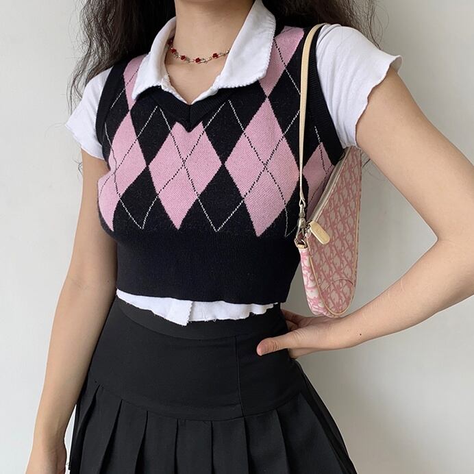 トップス ベスト ニット アーガイル 2色 レディース ショート丈 Vネック ノースリーブ オシャレ お洒落 きれいめ かわいい 大人可愛い ガーリー 10代 20代 30代 着回し 重ね着 シンプル カジュアル ラフ ジレ チョッキ ブラック 黒 グレー 灰色 ピンク くすみカラー 総柄 華奢 細見え タイト スリム 春 秋 冬 抜け感 こなれ感 ショッピング レトロ アンティーク ヴィンテージ 柔らか 着心地 学生 スクール 制服 脚長 スタイルアップ チェック柄 ダイヤ シック モダン