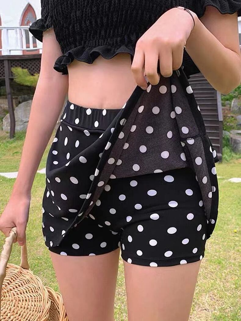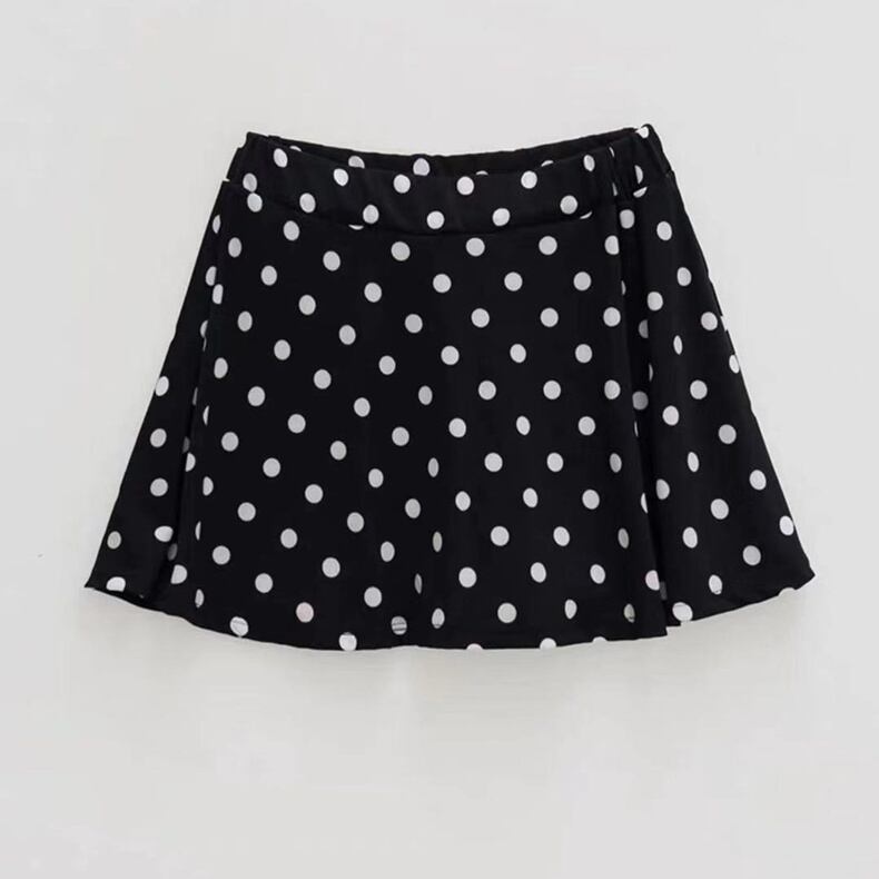 ボトムスはドット柄で、きれいなAラインシルエットに。