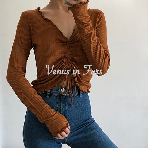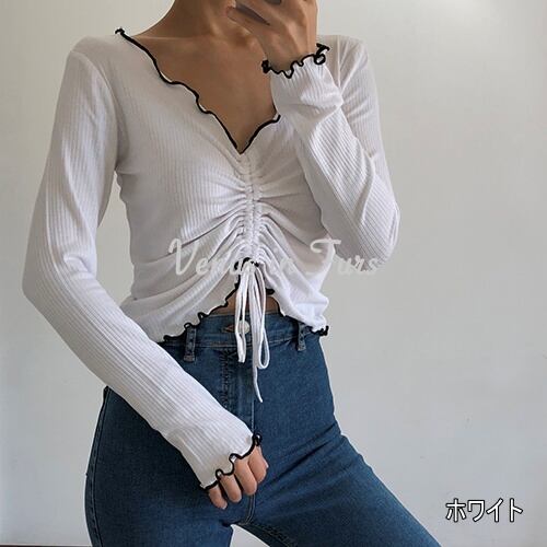 トップス シャツ カットソー 6色 レディース ギャザー きれいめ 上品 清楚 清潔感 エレガント お洒落 オシャレ フェミニン ガーリー フェアリー かわいい 大人可愛い 20代 30代 40代 50代 シンプル カジュアル 春 秋 冬 こなれ感 休日 お出かけ 買い物 女子会 韓国 トレンド 流行 ホワイト 白 黒 ブラック レッド 赤 グレー 灰色 茶色 ブラウン デコルテ 鎖骨 華奢 薄手 着回し 重ね着 S М ショート丈 脚長 美脚 Vネック タイト スリム 細身 カラバリ くすみカラー