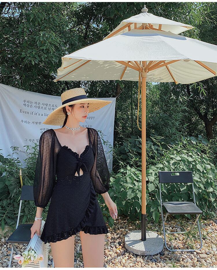 水着 スイムウエア レディース ワンピース水着 体型カバー水着 ボリューム袖 長袖 二の腕カバー フリル リボン シフォン ドット 水玉 透け感 シースルー ドッキング 切り替えデザイン ラップスカート バックシャン かわいい 大人可愛い きれいめ セクシー sexy ナチュラル 華やか おしゃれ お洒落 大人 大人っぽい レトロ 主役級 存在感 女っぽ M L XL 白 ホワイト 黒 ブラック レース 花柄 10代 20代 30代 40代 ママ ビーチ 海 夏 プール リゾート 旅行 美脚 脚長 着痩せ