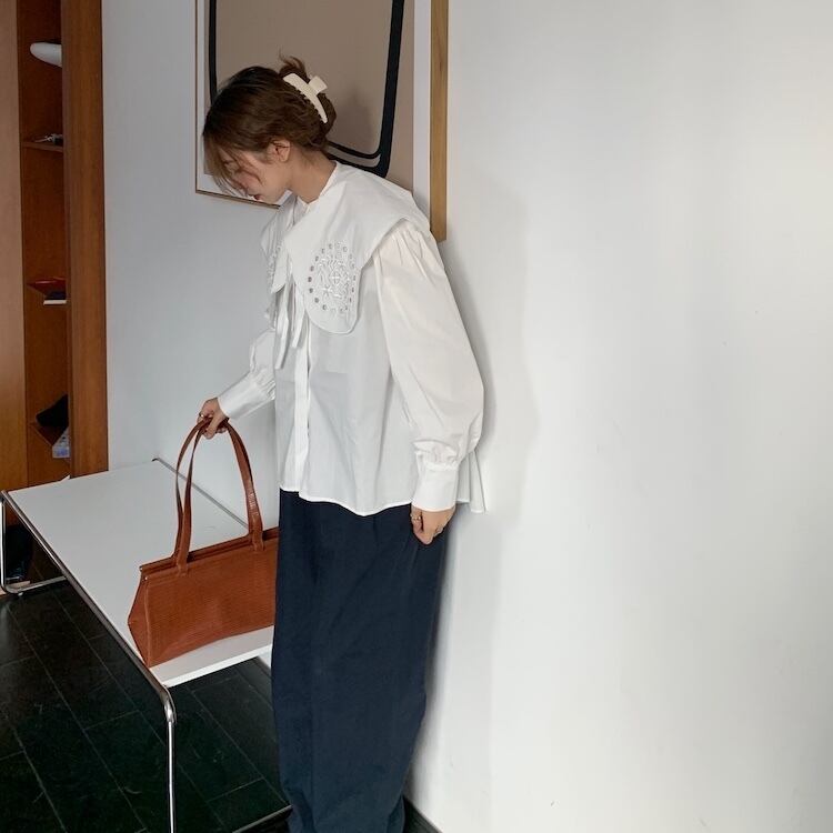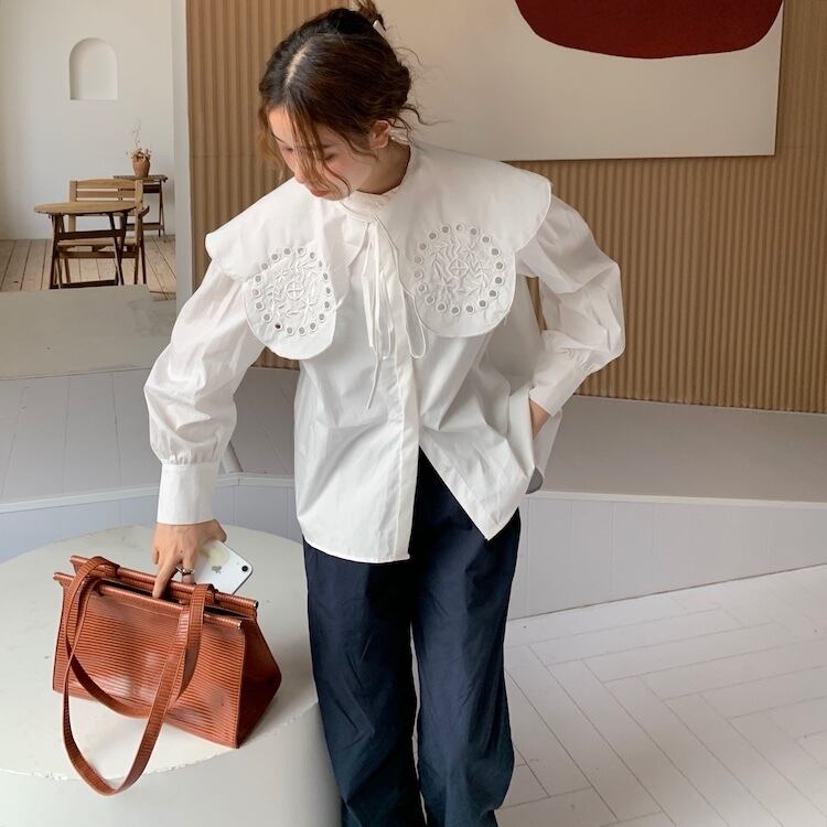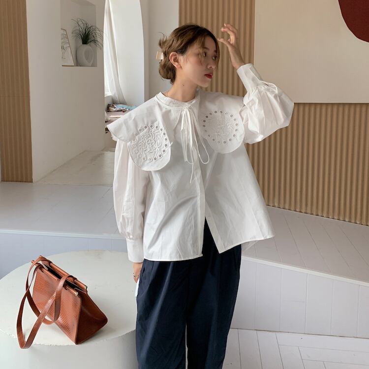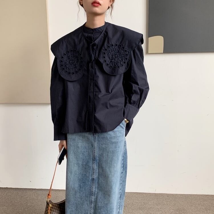 トップス ブラウス 2色 ビッグカラー 長袖 レディース オーバーサイズ セーラー襟 清楚 かわいい 大人可愛い ガーリー フェミニン シンプル カジュアル お洒落 オシャレ 大きめ ゆったり 体型カバー 着痩せ ホワイト 白 紺 ネイビー 韓国 トレンド 流行 春 夏 秋 冬 オールシーズン レトロ 10代 20代 30代 40代 女子会 インスタ 映え こなれ感 SNS 休日 お出かけ ショッピング 小顔 華奢 パフスリーブ ボリューム フリル レース スカラップ アンティーク ヴィンテージ
