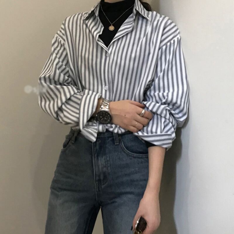 トップス ブラウス シャツ ストライプ 長袖 ゆったり レディース きれいめ 上品 大きめ ゆったり お洒落 オシャレ かわいい 大人可愛い 20代 30代 40代 50代 60代 ОL 通勤 仕事 オフィス シンプル カジュアル 春 秋 夏 冬 オールシーズン 休日 お出かけ 買い物 女子会 韓国 トレンド 流行 Iライン ストレート 体型カバー 着痩せ 着回し 薄手 ラフ ホワイト 白 グレー 灰色 清潔感 清楚 前開き ボタン 襟付き 知的 新作 2023 総柄 ドロップショルダー