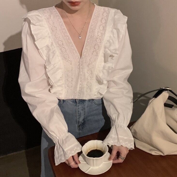 トップス ブラウス シャツ カットソー レース フリル Vネック 長袖 ゆったり レディース きれいめ 上品 エレガント 大きめ お洒落 オシャレ フェミニン ガーリー フェアリー かわいい 大人可愛い 10代 20代 30代 40代 50代 ОL 通勤 シンプル カジュアル 春 秋 冬 こなれ感 休日 お出かけ 女子会 韓国 トレンド 流行 Iライン ストレート 前開き 着心地 無地 白 ホワイト 体型カバー 着痩せ 映え SNS ギャザー ふんわり 着回し ヴィンテージ レトロ アンティーク