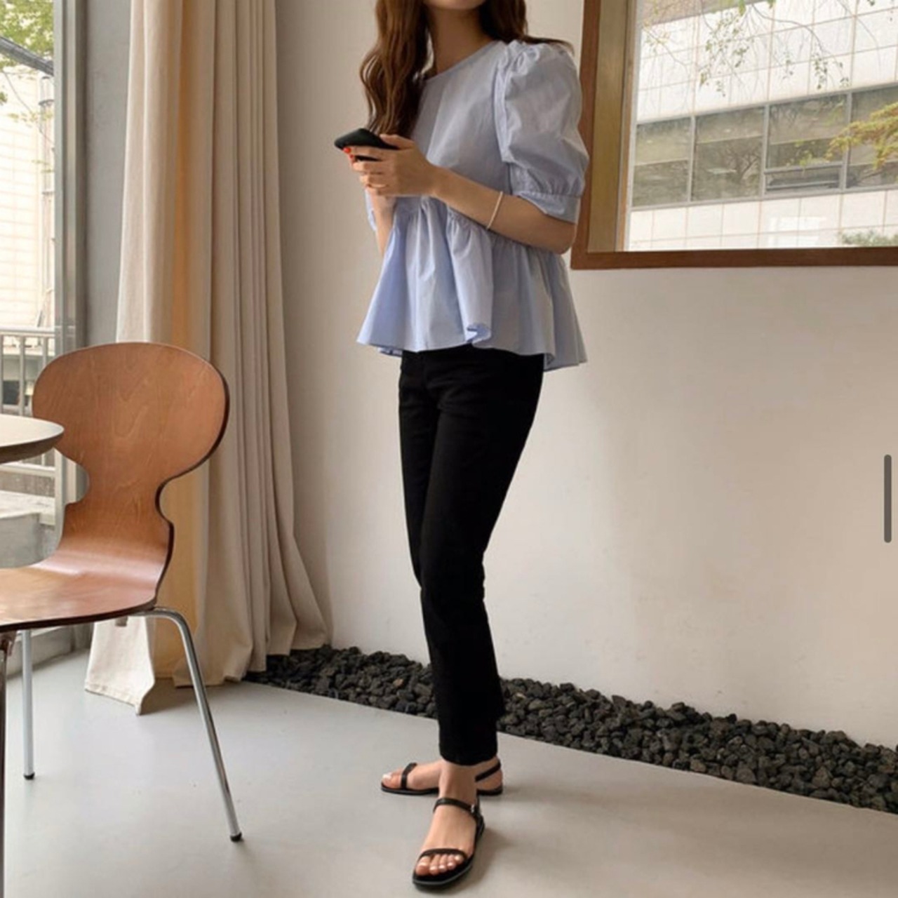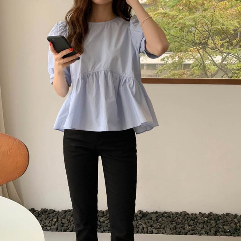 ペプラムシャツ トップス レディース シャツ ブラウス プルオーバー ペプラムブラウス ボリュームスリーブ 半袖 フレア ラウンドネック フェミニン 水色 ライトブルー 大人可愛い きれいめ 上品 エレガント ガーリー マニッシュ ルーズ キュート レトロ 大人女子 おしゃれ シンプル カジュアル 春 夏 秋 冬 二次会 オフィス OL 通勤 学生 通学 デート お出かけ パーティー イベント 女子会 休日 旅行 体型カバー モテ 普段使い 定番 トレンド ゆったり インスタ映え ニュアンスカラー