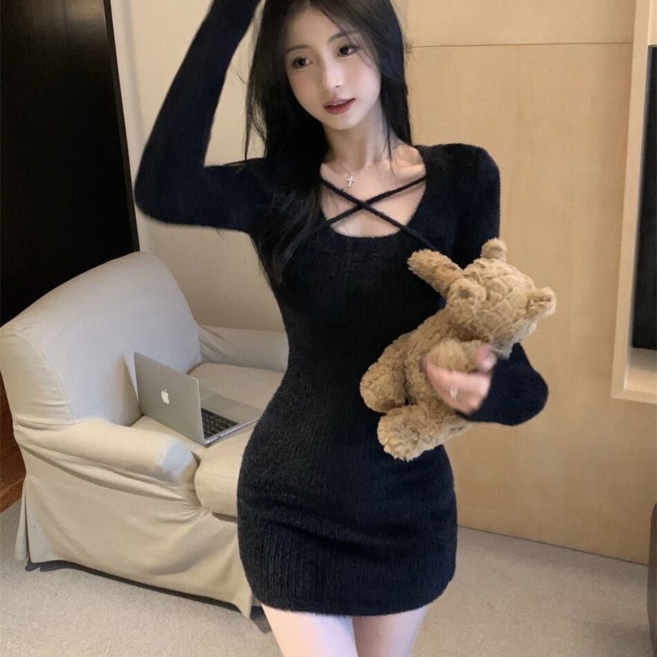 ワンピース ニット モヘア ショート丈 ミニ丈 タイト スリム 細身 レディース お洒落 オシャレ かわいい 大人可愛い セクシー シンプル カジュアル 無地 黒 ブラック 白 ホワイト 膝上 10代 20代 30代 40代 春 秋 冬 韓国 トレンド 流行 シンプル カジュアル ラフ こなれ感 個性的 個性派 デート モテ 女子会 休日 ショッピング お出かけ 映え SNS 楽ちん シック モード 大人女子 着痩せ 細見え 華奢 クロスデザイン 鎖骨 デコルテ ふわふわ もこもこ S М L