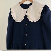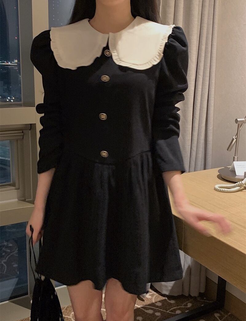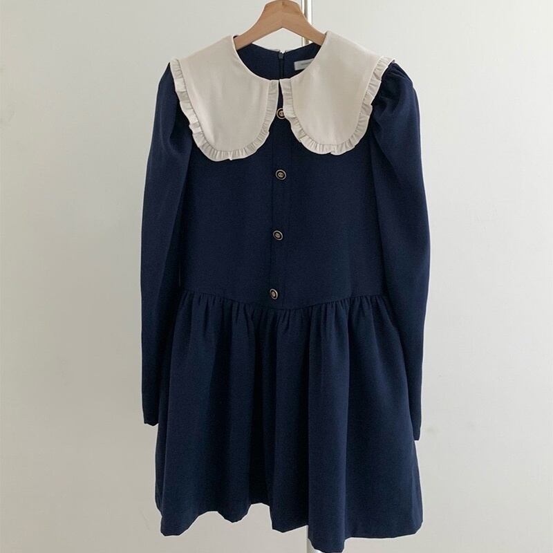 ワンピース 2色 ビッグカラー フリル 長袖 レディース バックデザイン 春 秋 冬 Aライン ふんわり ガーリー フェミニン シンプル カジュアル ゆったり 体型カバー 細見え 着痩せ オシャレ お洒落 かわいい 大人可愛い 10代 20代 30代 黒 ブラック ネイビー 紺 華奢 韓国 トレンド 流行 映え SNS 女子会 モテ デート 量産 地雷 姫系 ロリータ 学生 普段着 スタイルアップ パフスリーブ 膝丈 膝上 薄手 レトロ アンティーク ヴィンテージ