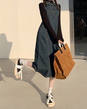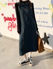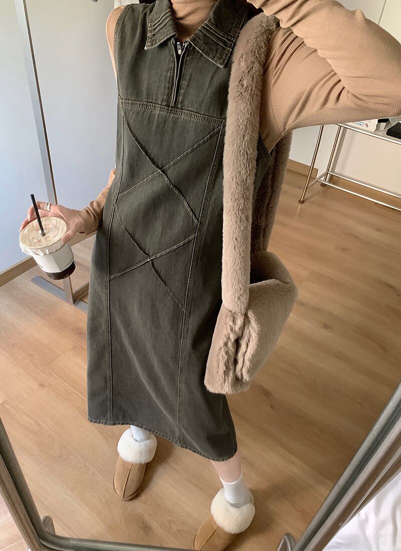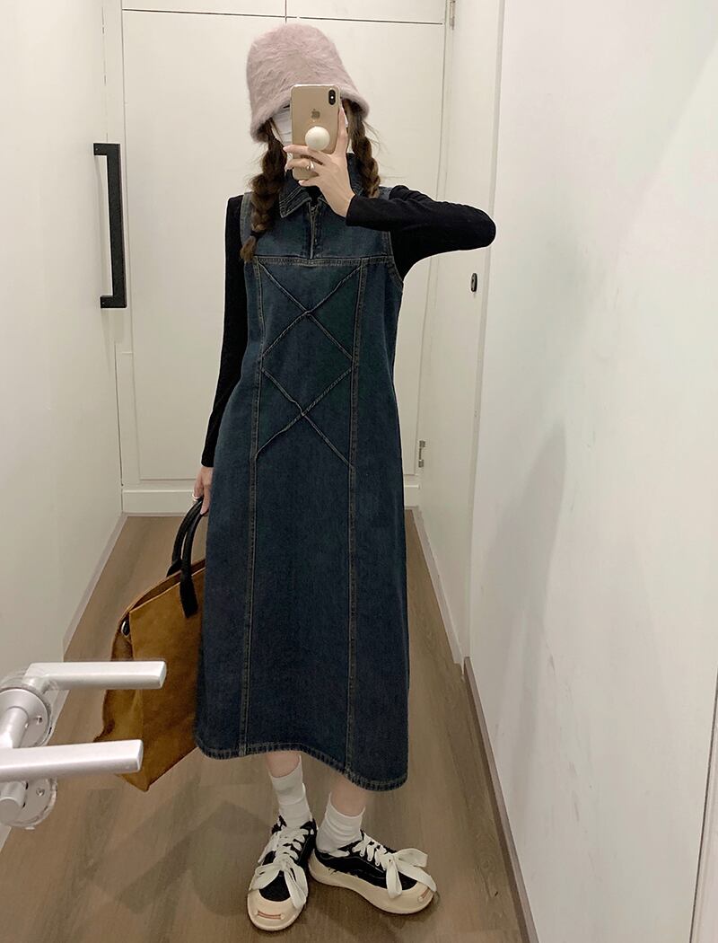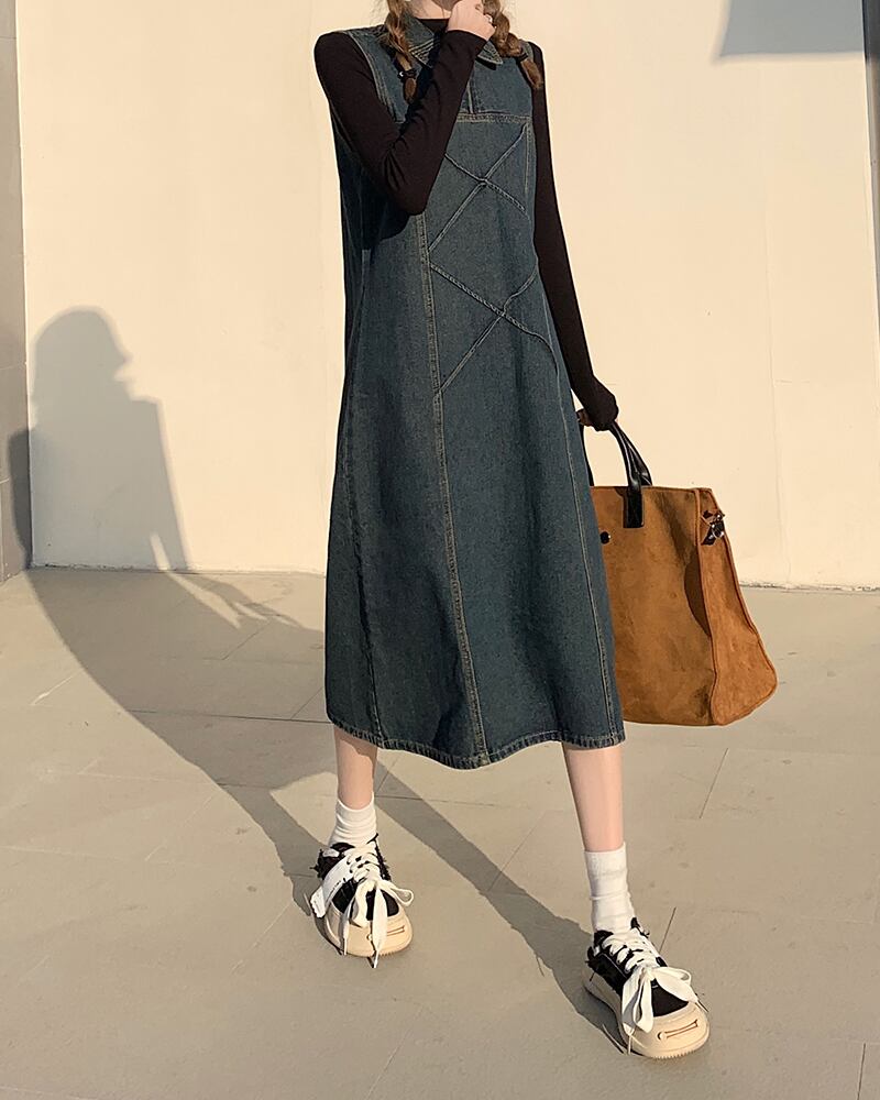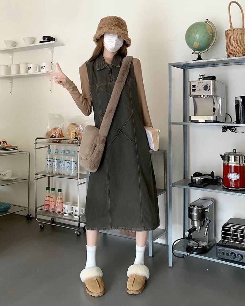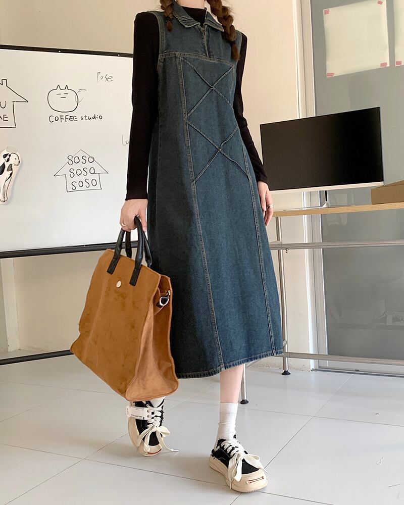 ワンピース デニム ジャンパースカート 2色 襟付き ジップアップ レディース サロペット Aライン オールインワン ジャンスカ ノースリーブ ひざ下丈 ロング丈 ミモレ丈 袖なし ブラック 黒 ブルー 青 かわいい 大人可愛い レトロ アンティーク ヴィンテージ キュート ガーリー 春 秋 冬 デート お出かけ 女子会 休日 ショッピング 公園 体型カバー 着痩せ 細見え ゆったり 大きめ ポケット 10代 20代 30代 40代 50代 シンプル カジュアル 色落ち ブリーチ加工 アンティーク