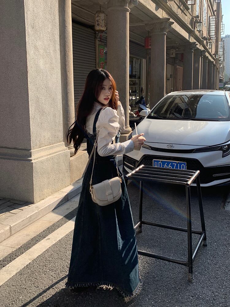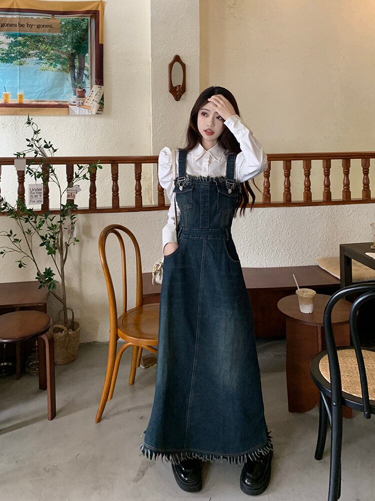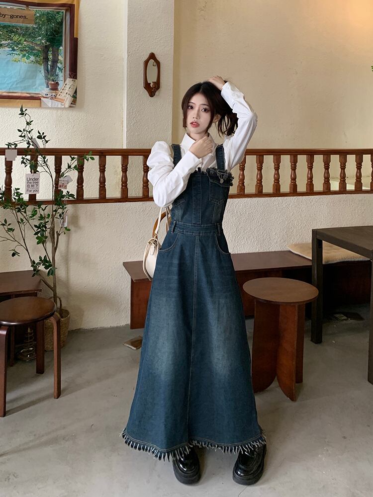 セットアップ 2点セット ジャンパースカート デニム ブラウス サロペット レディース Aライン オールインワン ワンピース ジャンスカ フリンジ ノースリーブ フレア ロング丈 マキシ丈 袖なし ブルー 青 ホワイト 白 かわいい 大人可愛い レトロ ヴィンテージ キュート ガーリー 春 秋 冬 パフスリーブ 長袖 襟付き 体型カバー 着痩せ 細見え ゆったり 大きめ ポケット 薄手 10代 20代 30代 40代 50代 シンプル ラフ カジュアル こなれ感 フリンジ 着回し ウエストマーク くびれ