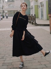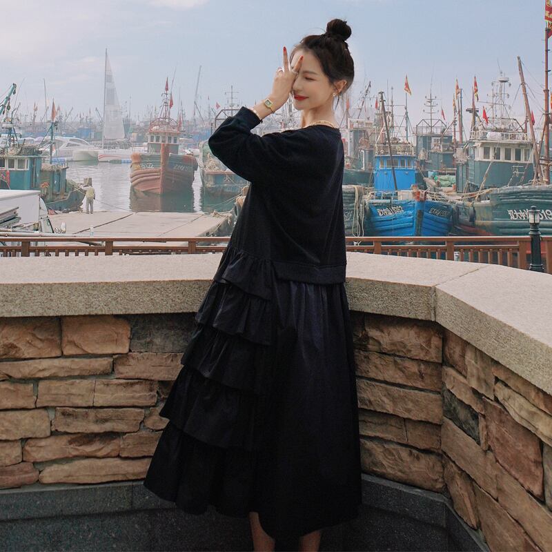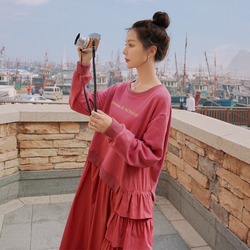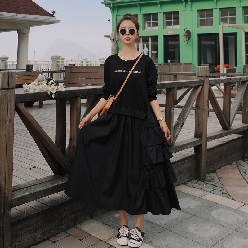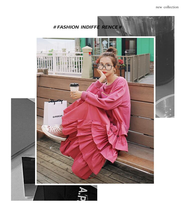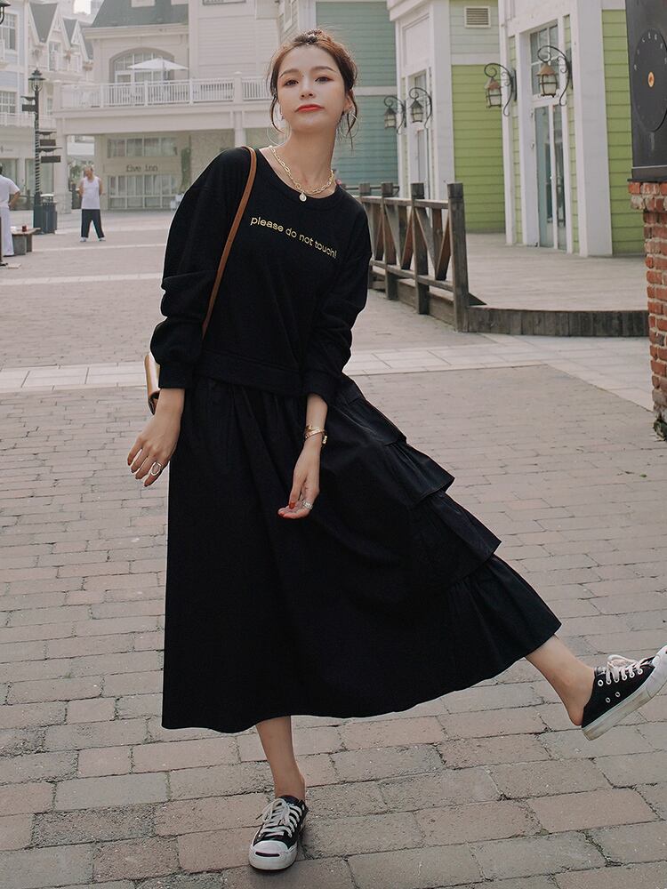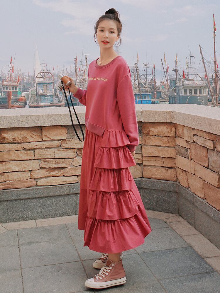 ワンピース スウェット トレーナー ギャザースカート ロングスカート フレアスカート アシンメトリー 長袖 クルーネック ドロップショルダー ドッキング 切り替えデザイン 英字ロゴ フリル かわいい 大人可愛い シンプル カジュアル おしゃれ お洒落 大人女子 こなれ感 ガーリー 抜け感 S M L XL 2XL 大きいサイズ 無地 春 秋 10代 20代 30代 40代 50代 ママ 学生 通学 デート お出かけ 休日 イベント 旅行 普段使い 韓国 オルチャン 楽ちん 体型カバー