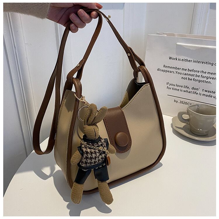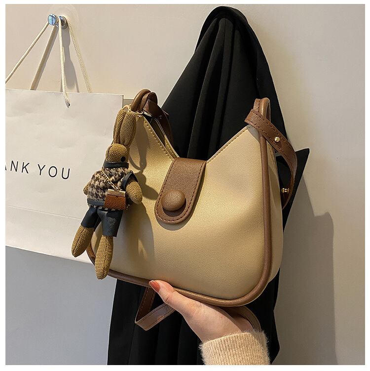 キュートなウサギのマスコット付きショルダーバッグ。