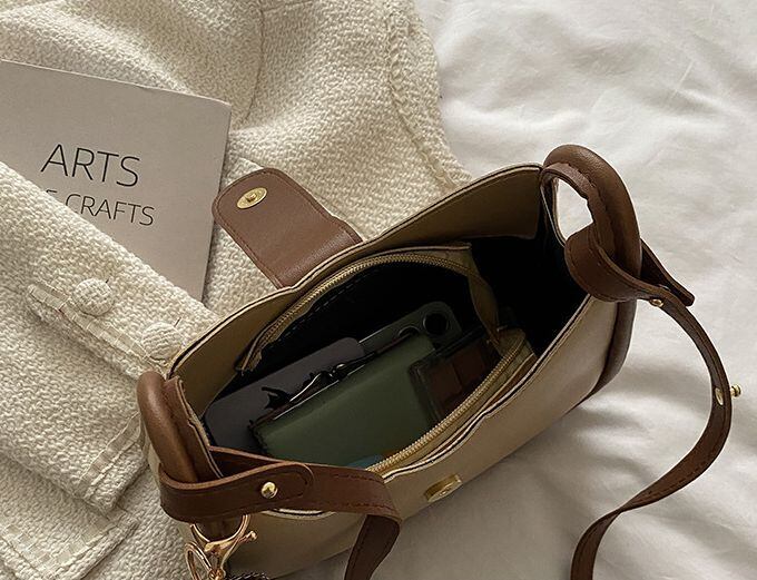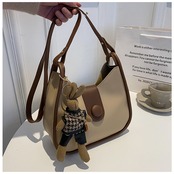 3色カラバリ、マスコット付き合皮ショルダーバッグ。