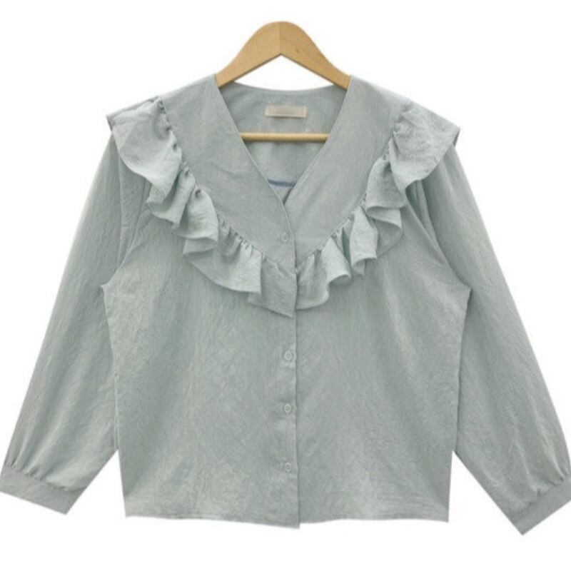 トップス レディース シャツ ブラウス 前開き ボタン Vネック 襟なし 長袖 フリル 大人可愛い きれいめ シンプル 大人 上品 おしゃれ お洒落 レトロ 大人女子 こなれ感 エレガント フェミニン ガーリー ラブリー キュート 存在感 抜け感 S M L XL 無地 春 秋 白 アイボリー 水色 ブルー 青 10代 20代 30代 40代 50代 ママ オフィス ビジネス OL 通勤 学生 通学 デート お出かけ 公園デビュー 女子会 休日 旅行 普段使い デイリー 重ね着 着回し モテ
