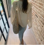 2色カラバリ、Vネックフリルシャツブラウス。