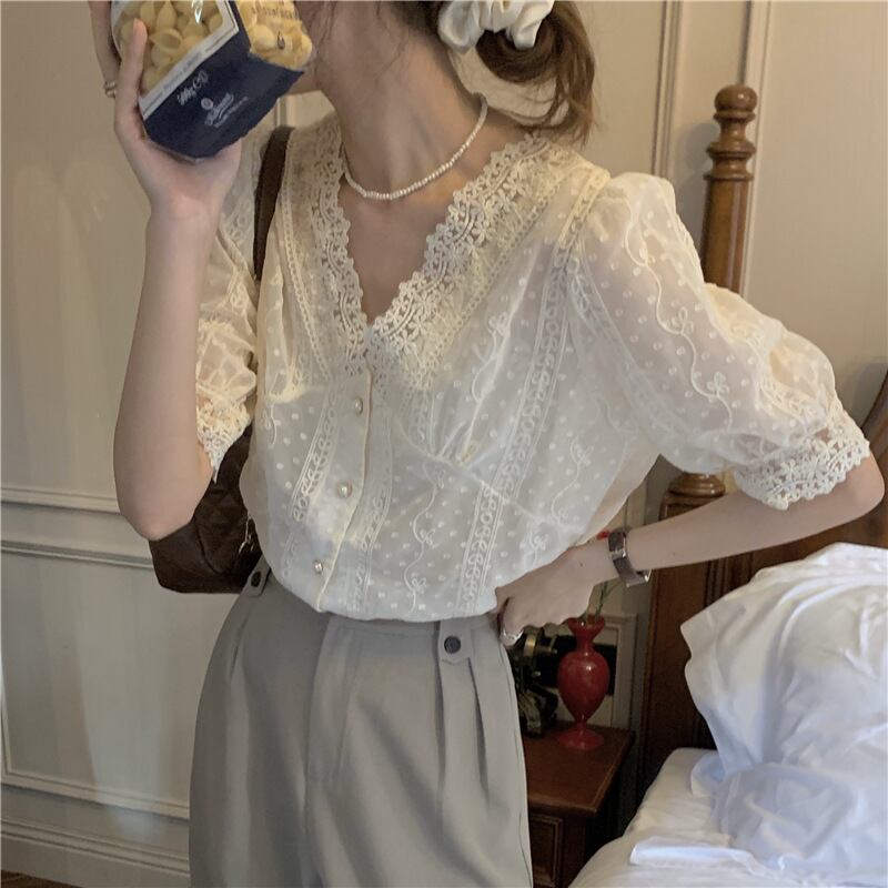 トップス レディース シャツ ブラウス 前開き パールボタン Vネック 襟なし 半袖 パフスリーブ レース 透け感 大人可愛い きれいめ シンプル 大人 上品 おしゃれ お洒落 レトロ 大人女子 こなれ感 エレガント フェミニン ガーリー ラブリー 存在感 抜け感 ワンサイズ フリーサイズ 無地 春 夏 秋 白 アイボリー 黒 ブラック 10代 20代 30代 40代 50代 ママ 学生 通学 デート お出かけ 女子会 休日 旅行 普段使い デイリー 重ね着 着回し モテ 韓国 オルチャン