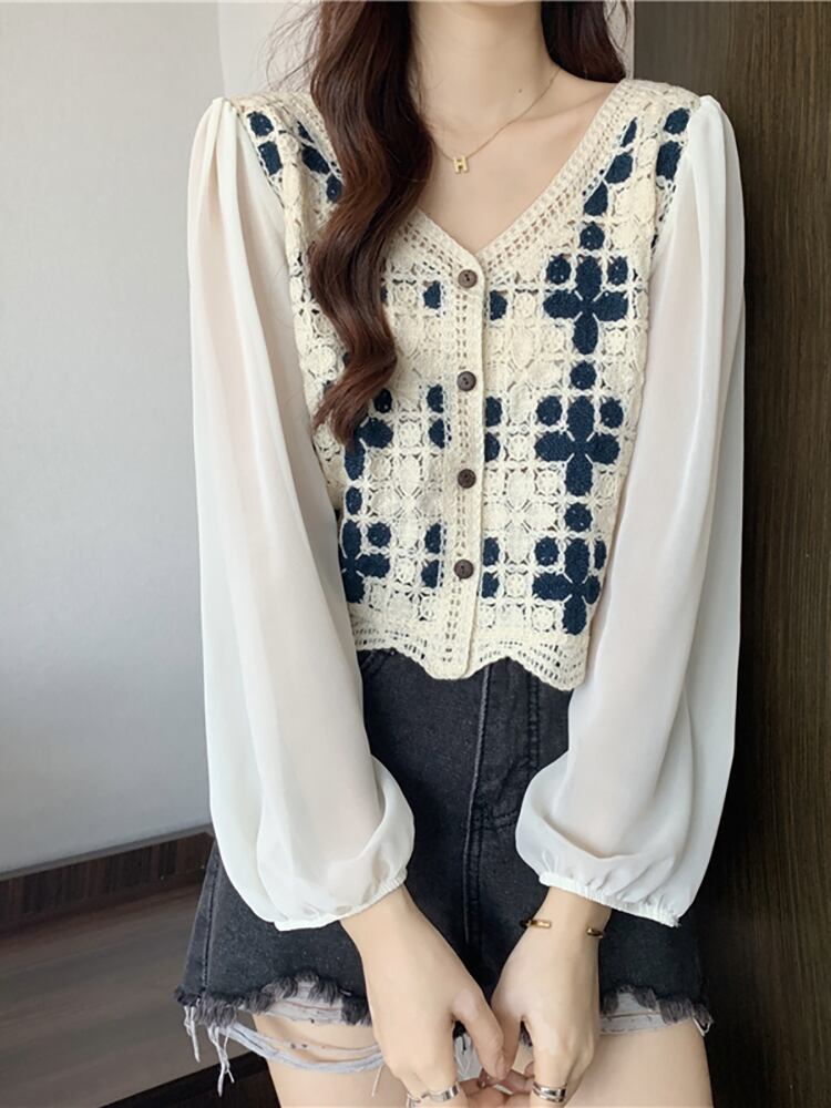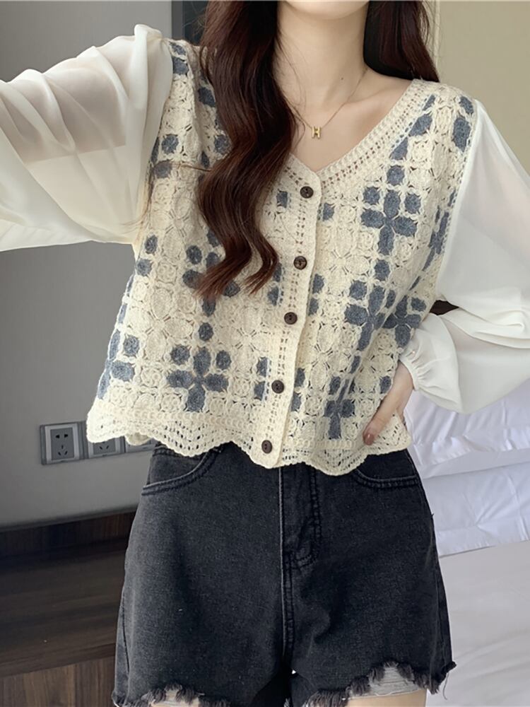 トップス レディース ニットカーディガン クロップド丈 長袖 Vネック ボリューム袖 パフスリーブ シフォン袖 異素材MIX クロシェ編み かわいい 大人可愛い おしゃれ お洒落 レトロ 大人女子 こなれ感 キュート 存在感 抜け感 フリーサイズ ワンサイズ 春 秋 10代 20代 30代 40代 フラワー 花柄 グレー 灰色 ブラウン 茶色 紺 ネイビー 学生 通学 お出かけ 公園デビュー 休日 旅行 普段使い アウトドア デイリー 重ね着 定番 着回し