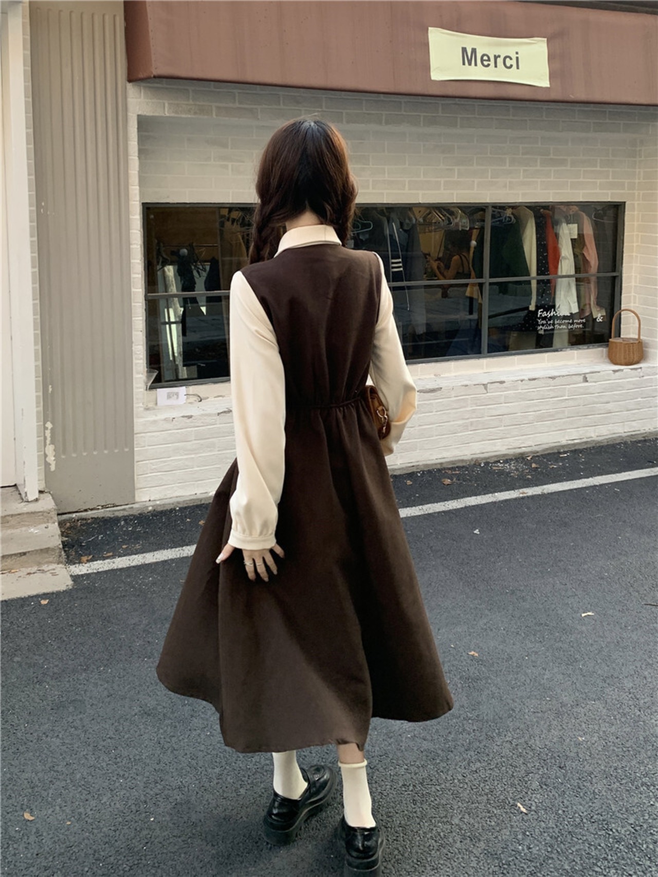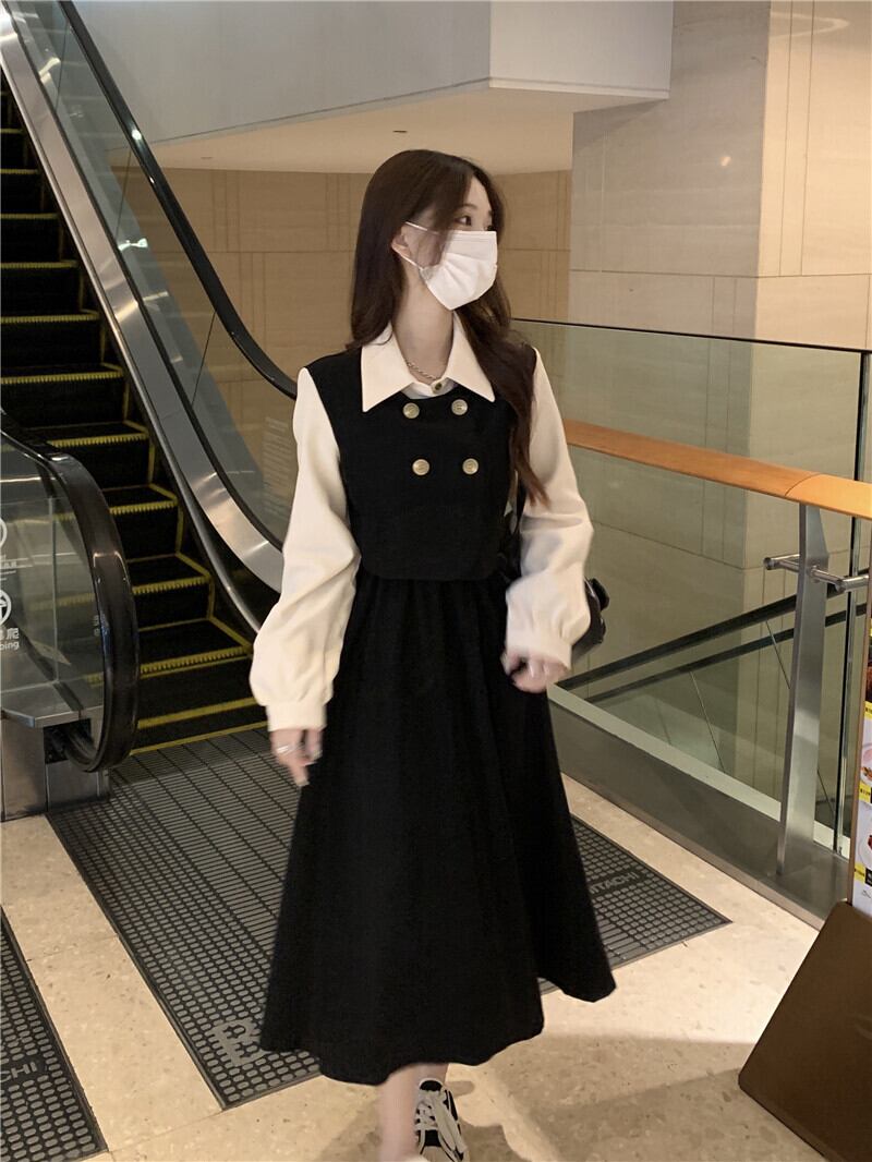 ワンピース レディース ジャンパースカート風 ジャンスカ風 ツーピース風 切り替えデザイン 長袖 襟付き ロング丈 フレア ギャザースカート ベスト風 ボタン かわいい きれいめ 上品 おしゃれ お洒落 レトロ キュート ガーリー こなれ感 抜け感 フェミニン 存在感 フリーサイズ ワンサイズ ベージュ 黒 ブラック ブラウン 茶色 無地 春 秋 10代 20代 30代 40代 デート お出かけ 女子会 休日 イベント 旅行 韓国 オルチャン 普段使い デイリー プレゼント ギフト モテ