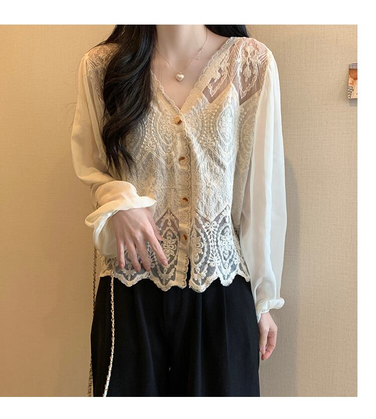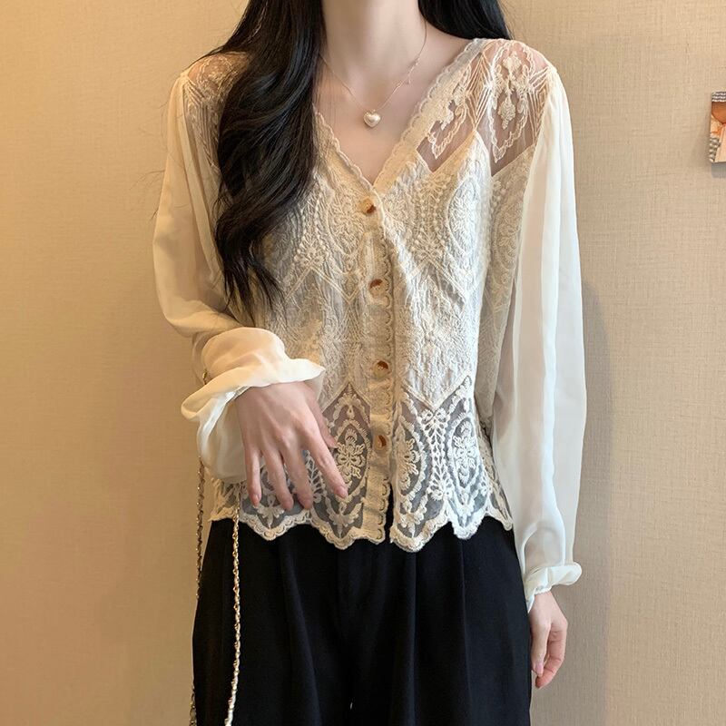 2色カラバリ、シフォン長袖レース襟なしシャツブラウス。