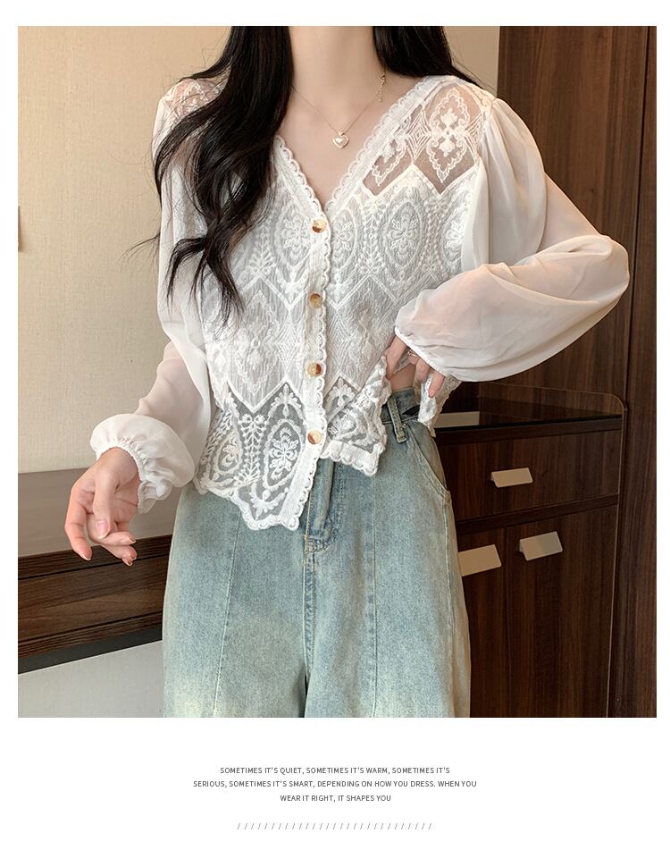 トップス レディース ブラウス シャツ カーディガン Vネック 長袖 ボタン 前開き パフスリーブ シースルー シフォン袖 レース 透け感 大人可愛い きれいめ 大人 上品 おしゃれ お洒落 レトロ 大人女子 個性的 こなれ感 エレガント フェミニン ガーリー ラブリー 存在感 とろみ感 抜け感 ワンサイズ フリーサイズ アイボリー 白 生成 きなり ホワイト 春 夏 秋 10代 20代 30代 40代 50代 60代 ママ 学生 通学 デート お出かけ 女子会 休日 旅行 普段使い デイリー 重ね着