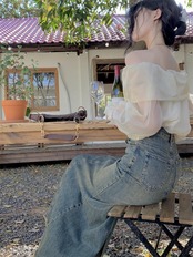 アイボリーカラーのオフショルシアーブラウス。