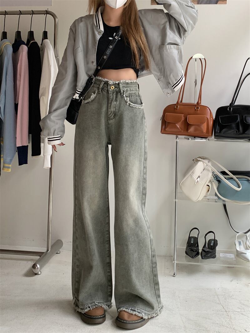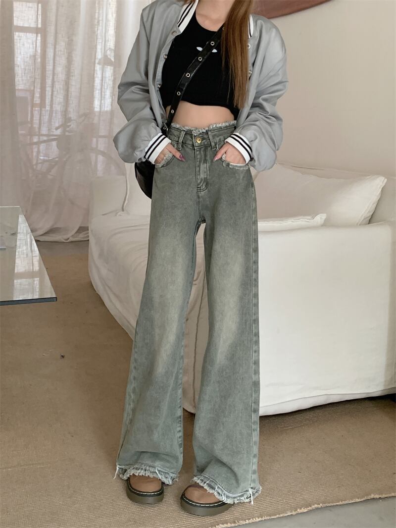 グレーカラーのハイウエストワイドストレートデニムパンツ。