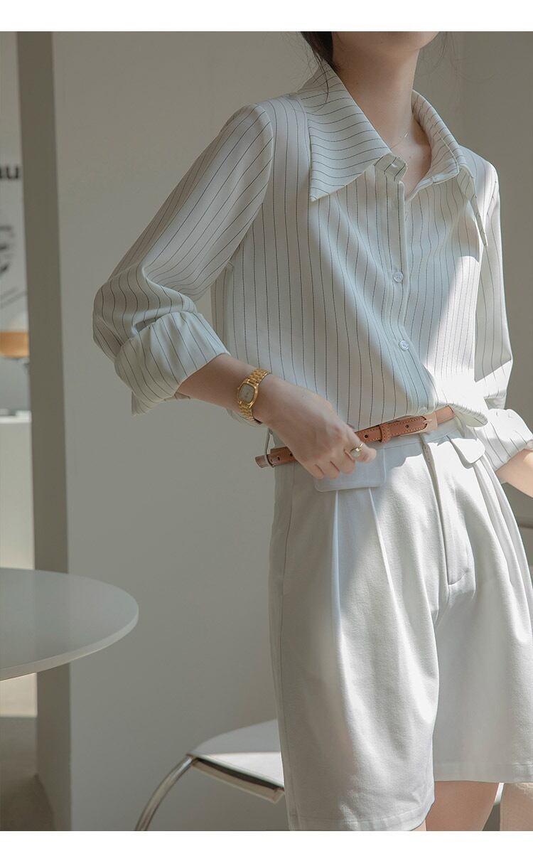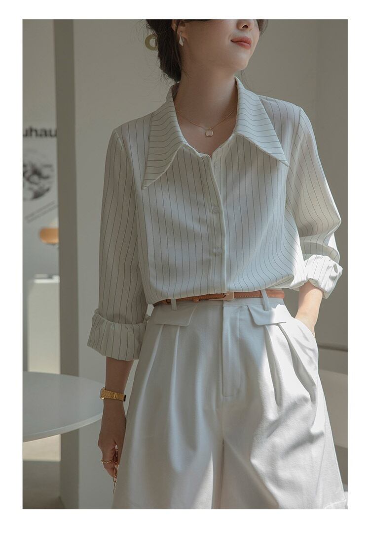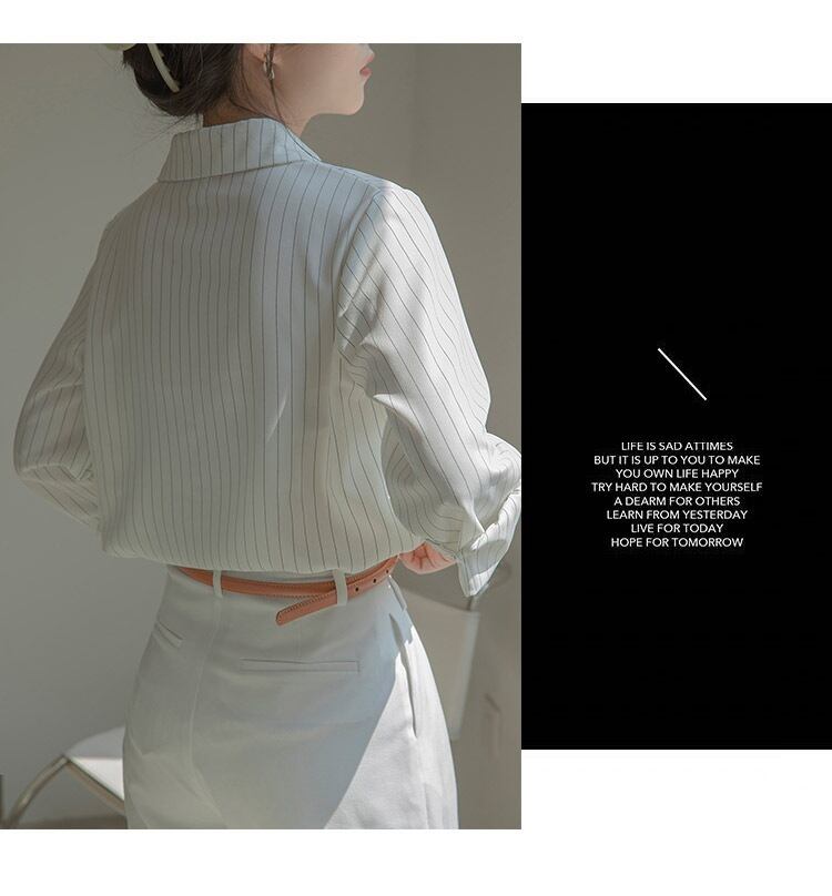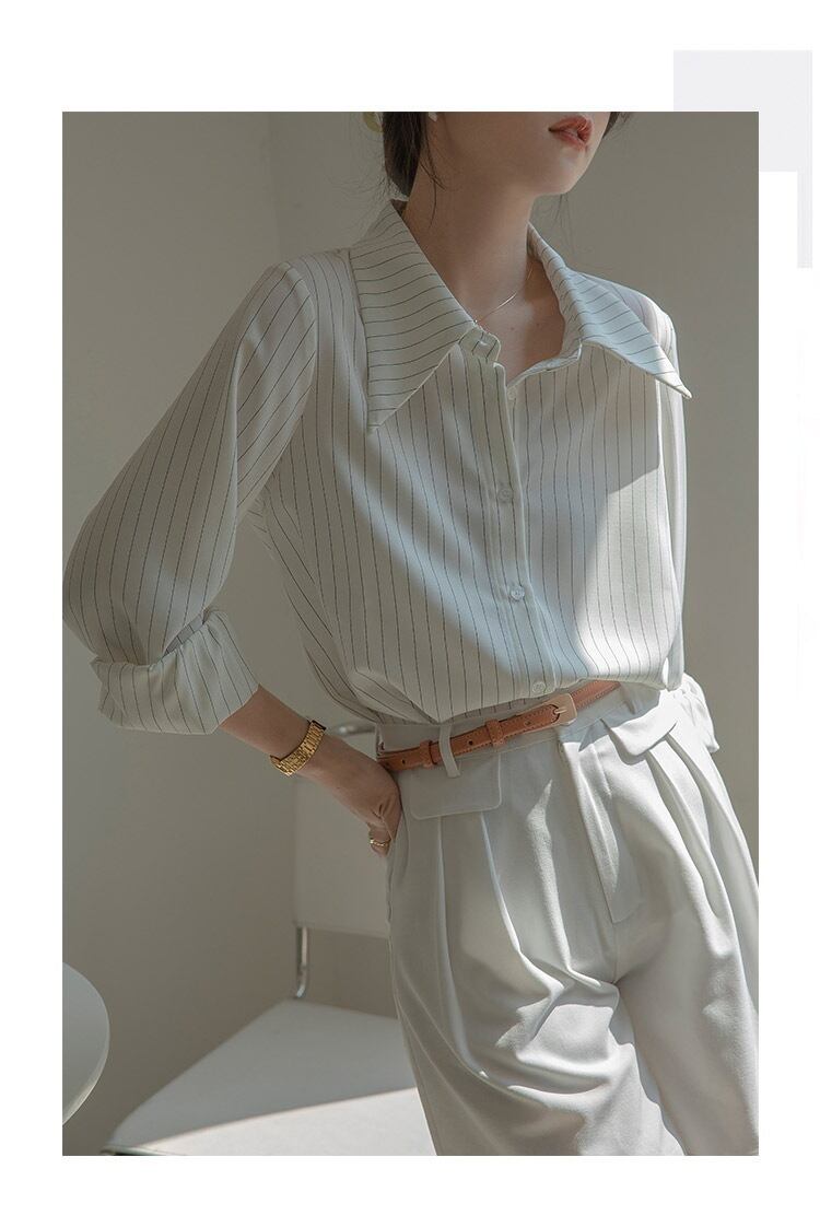 ホワイトカラーのストライプ柄長袖シャツブラウス。
