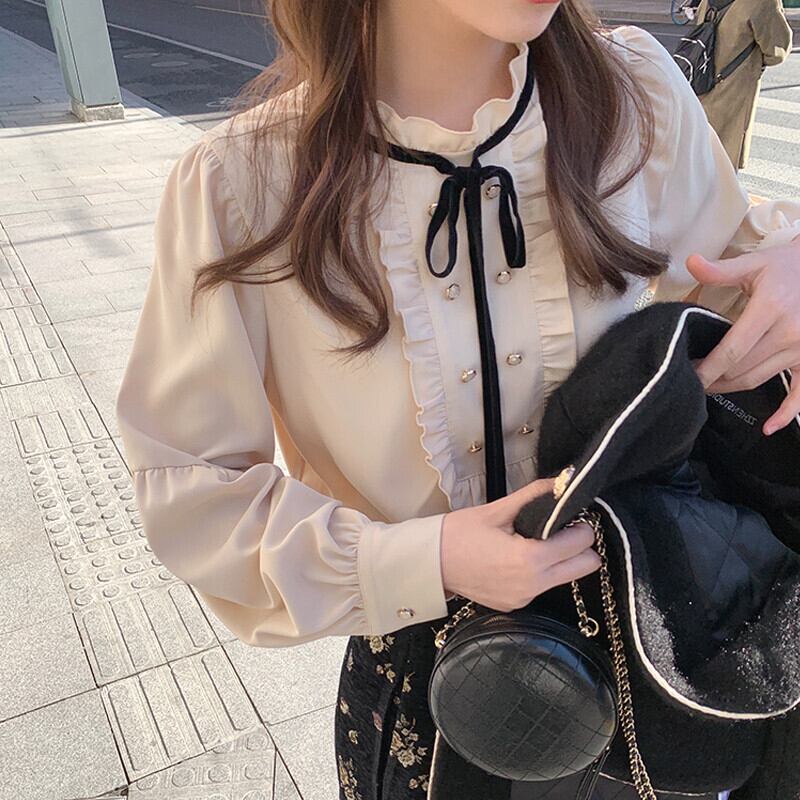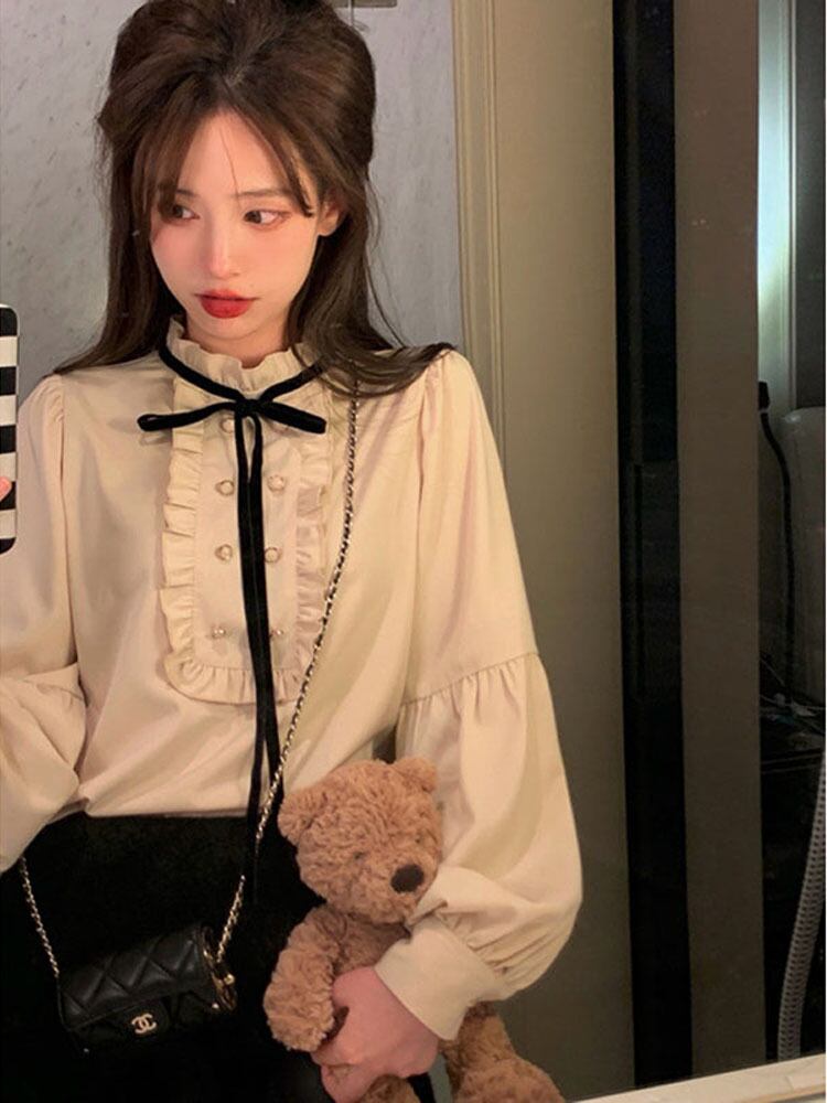 トップス ブラウス カットソー プルオーバー フリル襟 長袖 パフスリーブ ボタン リボン かわいい 大人可愛い きれいめ 大人 上品 おしゃれ お洒落 かっこいい 大人女子 キュート ラブリー ガーリー ドーリー 存在感 フェミニン エレガント M L XL 2XL 3XL 4XL 大きいサイズ ベージュ 無地 春 秋 10代 20代 30代 40代 50代 入学式 入園式 卒業式 卒園式 オフィス ビジネス OL 通勤 通学 学生 お出かけ 休日 デート 旅行 普段使い デイリー モテ プレゼント