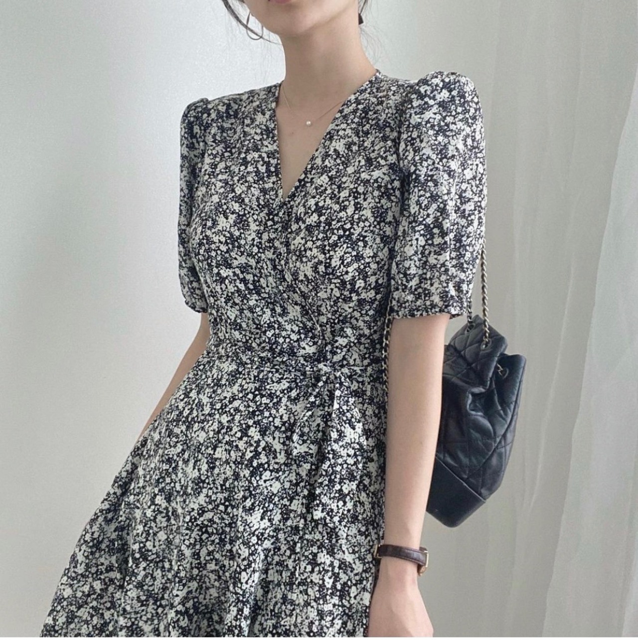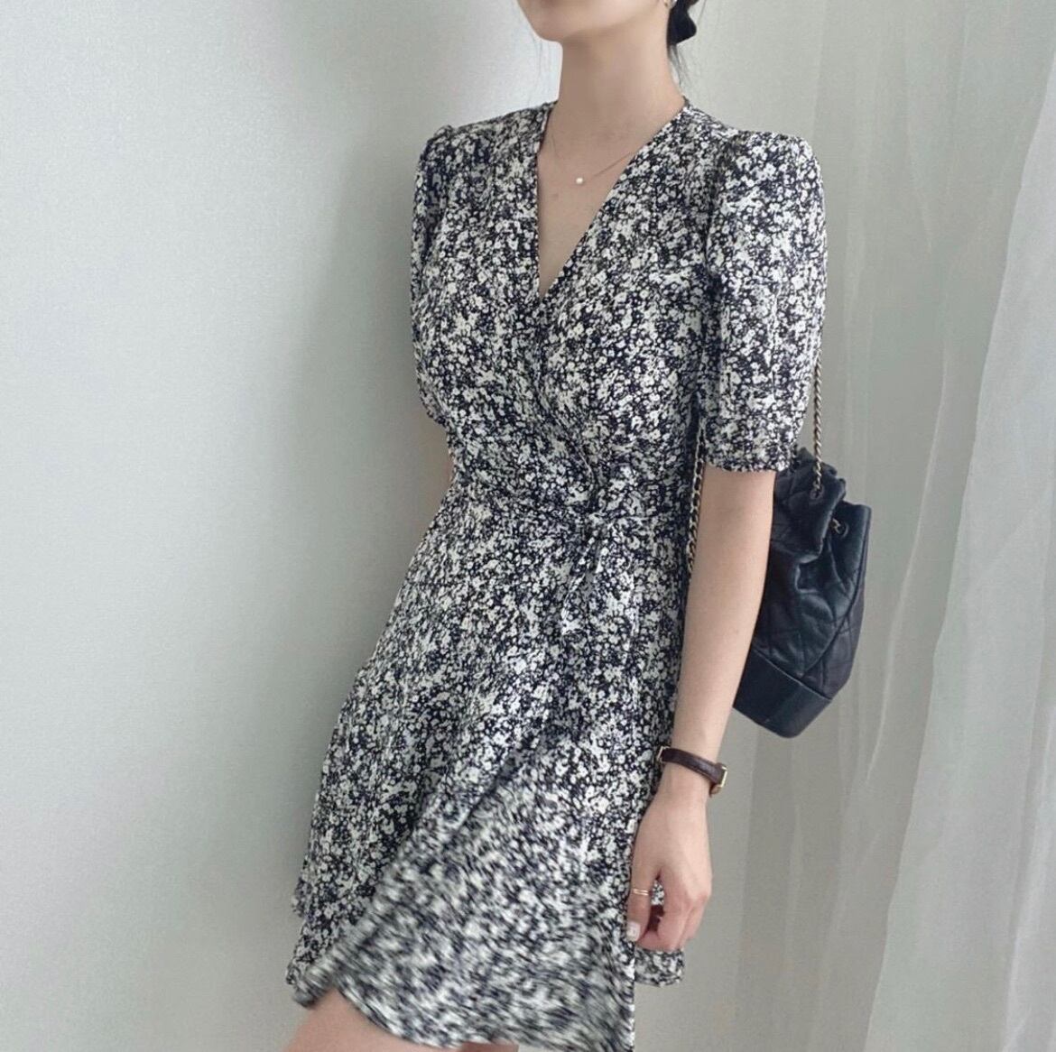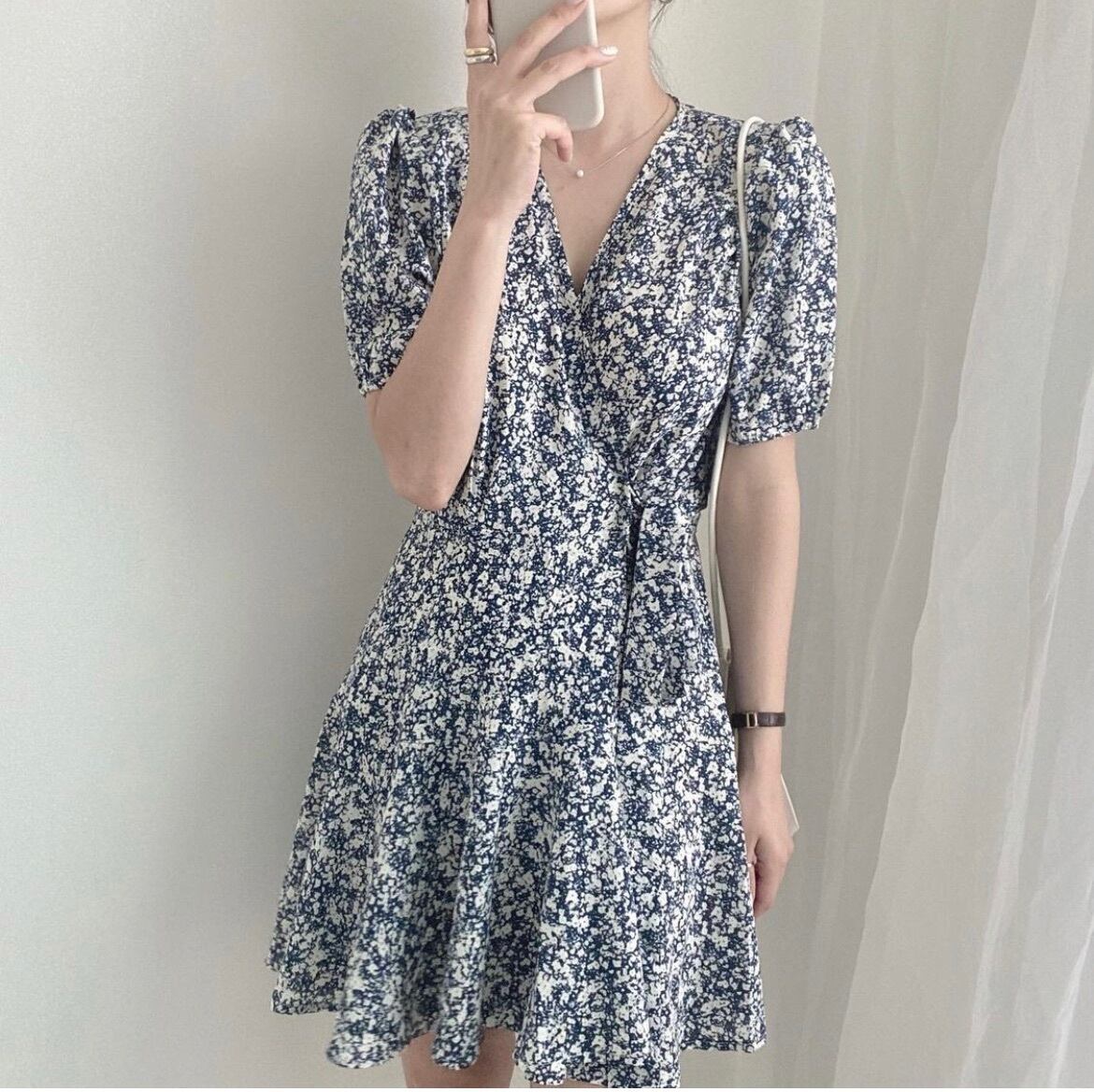 ワンピース レディース ミニワンピース Aライン フレア 襟なし パフスリーブ カシュクール Vネック 半袖 ウエストマーク 大人可愛い きれいめ シンプル 大人 上品 おしゃれ お洒落 清楚 大人女子 エレガント フェミニン 存在感 爽やか ワンサイズ フリーサイズ 黒 ブラック 紺 ネイビー 小花柄 フラワー 春 夏 秋 10代 20代 30代 40代 学生 通学 デート お出かけ 女子会 旅行 イベント 美脚 脚長 プレゼント ギフト 定番 モテ 韓国 オルチャン デイリー 普段使い