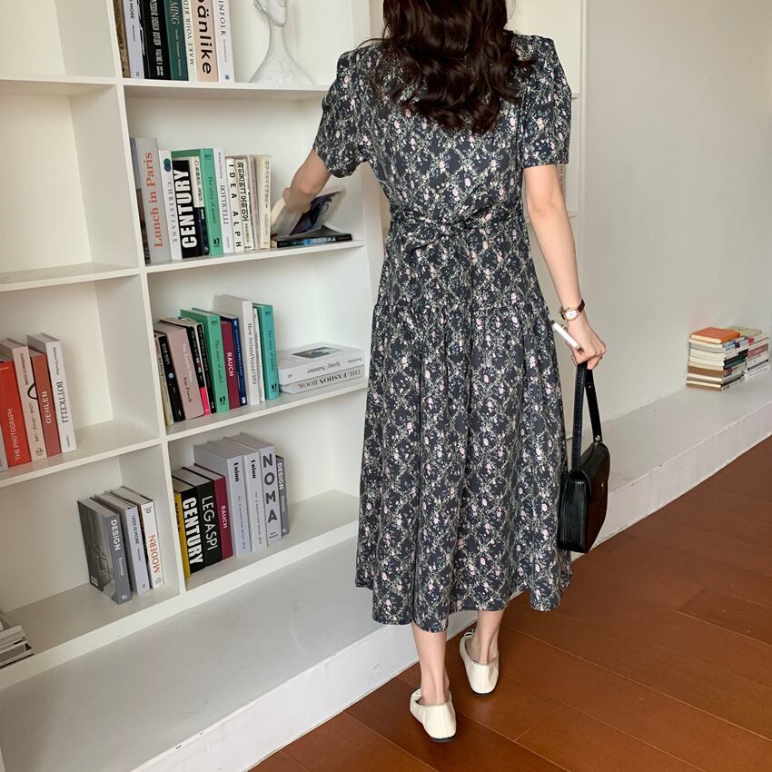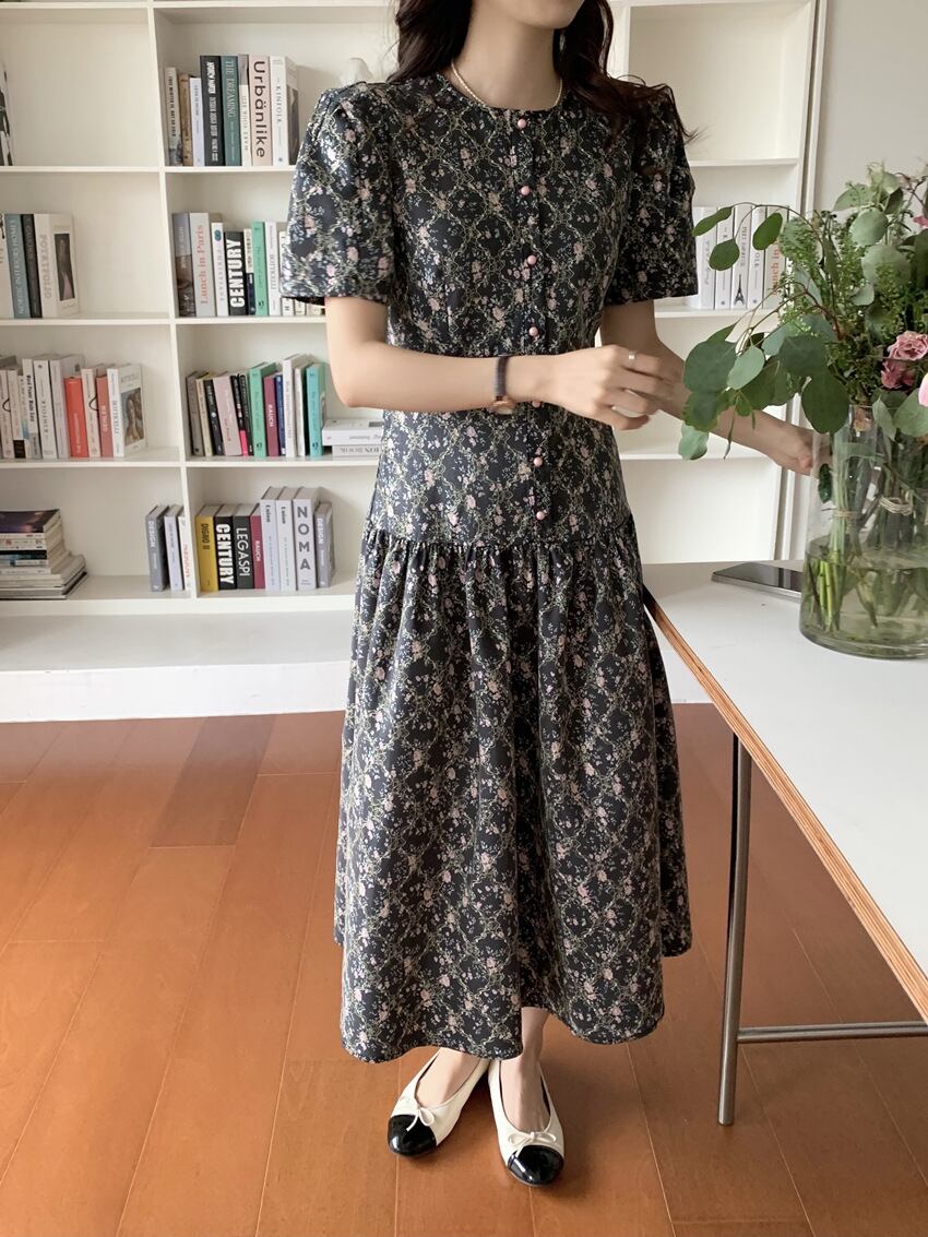 2色カラバリ、半袖ロング丈花柄ワンピース。