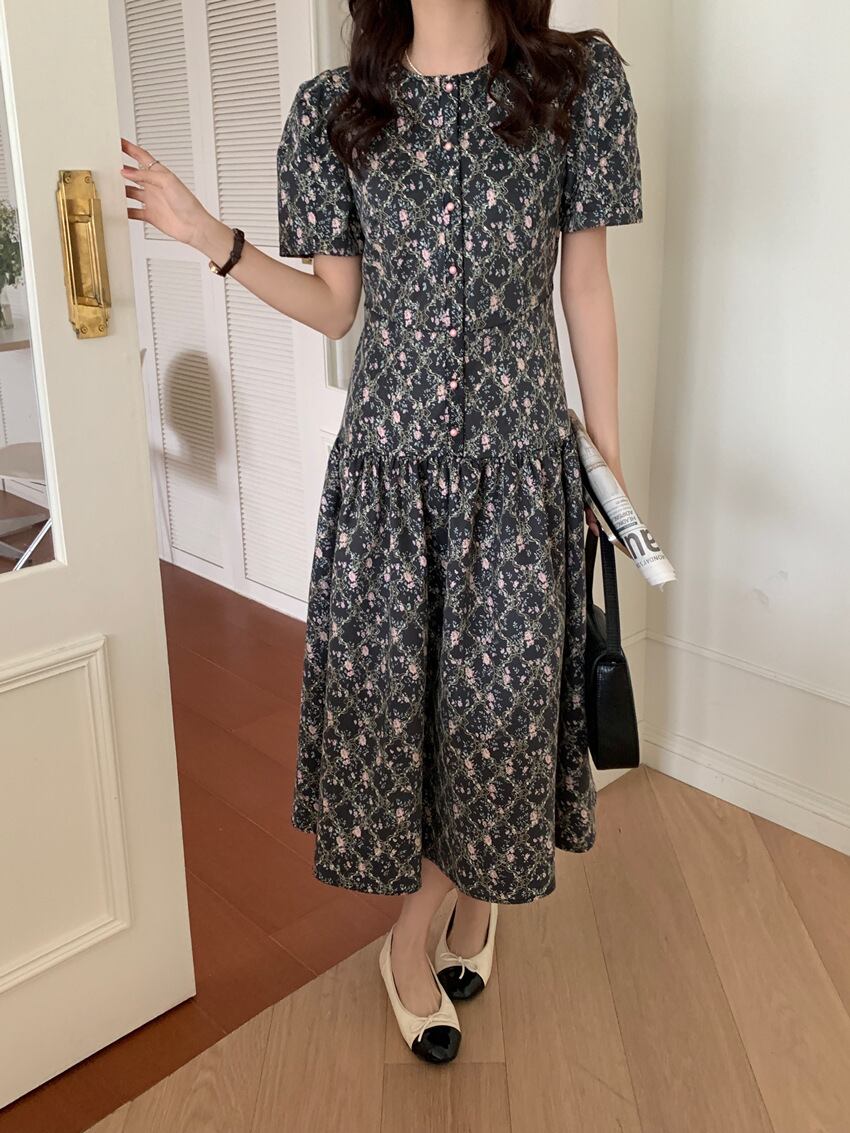 ワンピース レディース ロング丈 半袖 ボタン セミフレア クルーネック ラウンドネック 襟なし ティアード調 ギャザー ふんわり かわいい 大人可愛い きれいめ ナチュラル 大人 上品 おしゃれ お洒落 大人女子 エレガント フェミニン 清楚 ラブリー ガーリー 存在感 ワンサイズ フリーサイズ ベージュ 黒 ブラック 白 アイボリー 小花柄 フラワー柄 春 夏 秋 10代 20代 30代 40代 50代 デート お出かけ 休日 イベント 旅行 リゾート プレゼント ギフト 普段使い デイリー 韓国