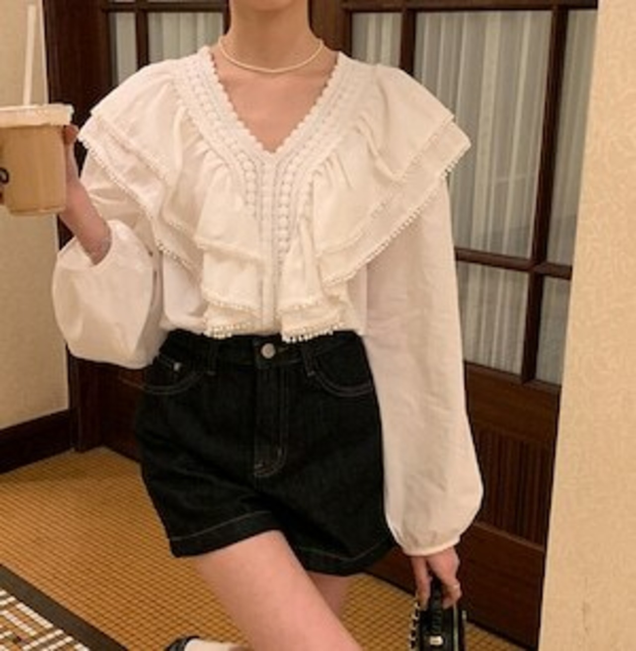 トップス レディース ブラウス 白トップス カットソー プルオーバー Vネック 長袖 フリル襟 レース ビッグカラー 大人可愛い きれいめ シンプル カジュアル 大人 上品 おしゃれ お洒落 存在感 かっこいい 大人女子 ラブリー キュート ガーリー ルーズ こなれ感 抜け感 ふんわり 体型カバー レイヤード ワンサイズ フリーサイズ 白 ホワイト 無地 春 秋 10代 20代 30代 40代 50代 60代 通学 学生 お出かけ 休日 旅行 イベント 普段使い デイリー 韓国 オルチャン