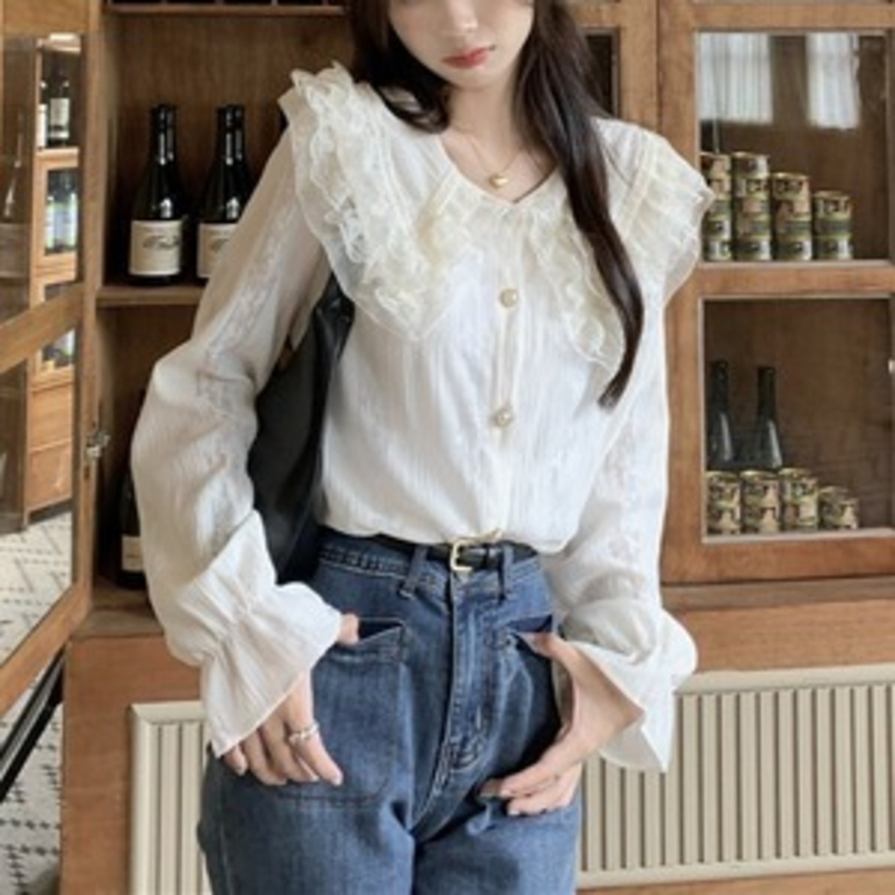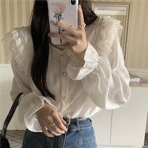 アイボリーカラーのフリルレース襟長袖ブラウス。