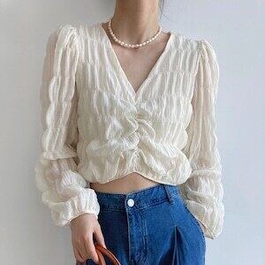 トップス レディース シフォンブラウス カットソー プルオーバー クロップド丈 Vネック シャーリング 長袖 襟なし パフスリーブ 大人可愛い きれいめ 大人 上品 おしゃれ お洒落 存在感 大人女子 かっこいい こなれ感 抜け感 ふんわり 個性的 クール フェミニン 体型カバー M L 白 アイボリー 無地 春 夏 秋 10代 20代 30代 40代 50代 60代 デート お出かけ 女子会 休日 旅行 普段使い デイリー 韓国 オルチャン 着回し デート