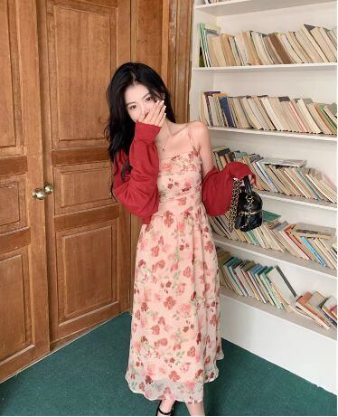 ピンクカラーの花柄ミモレ丈キャミソールワンピース。