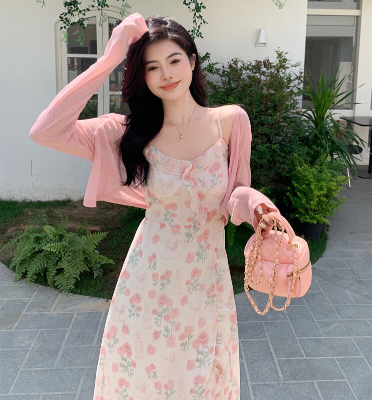 ピンクカラーの花柄ミモレ丈キャミソールワンピース。