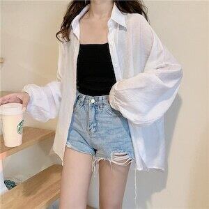 シンプルな白シャツも透け感で軽やかな着心地と涼し気な印象に◎