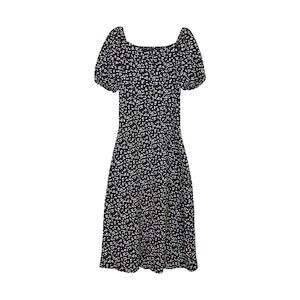 ブラックカラーの小花柄ハートネックミモレ丈ワンピース。