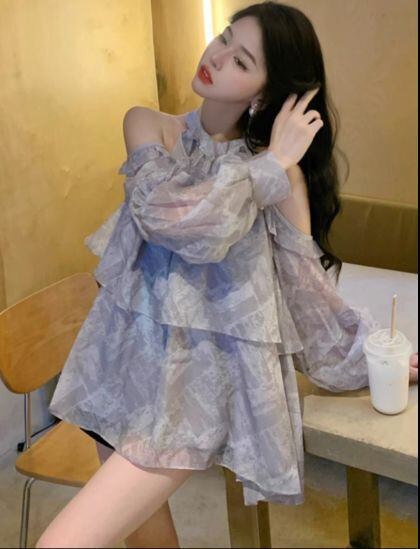 トップス レディース シフォンブラウス プルオーバー 長袖 ホルターネック 肩出し 肩見せ 透け感 薄手 フリル ティアード 大人可愛い きれいめ 大人 上品 おしゃれ お洒落 大人女子 かっこいい エレガント セクシー フェミニン 存在感 抜け感 こなれ感 S M L グレー 灰色 柄 華奢見え 体型カバー 二の腕カバー 春 夏 秋 20代 30代 40代 50代 女子会 デート お出かけ 休日 イベント 旅行 リゾート 普段使い デイリー 着回し 重ね着 韓国 オルチャン モテ
