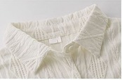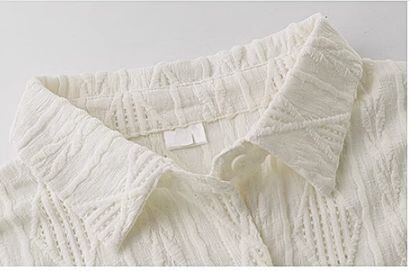 ホワイトカラーの幾何学透かし模様長袖シャツブラウス。