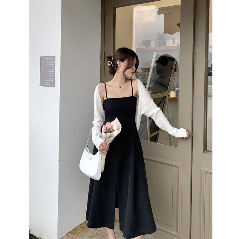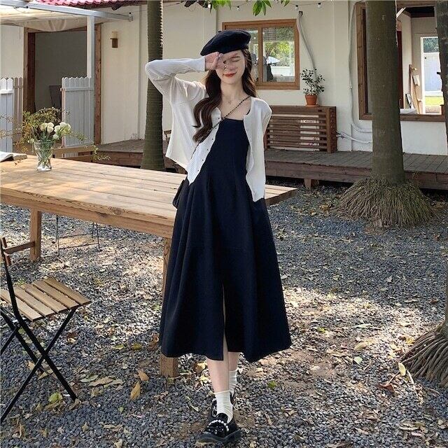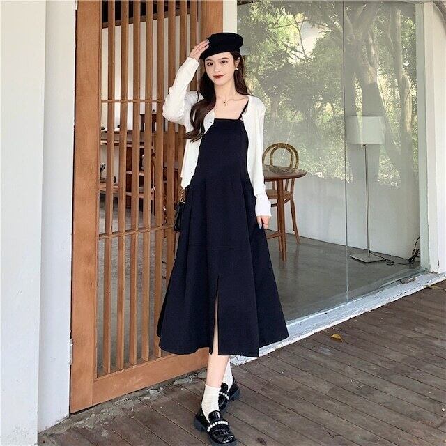 ブラックカラーのスリット入りミモレ丈キャミソールワンピース。