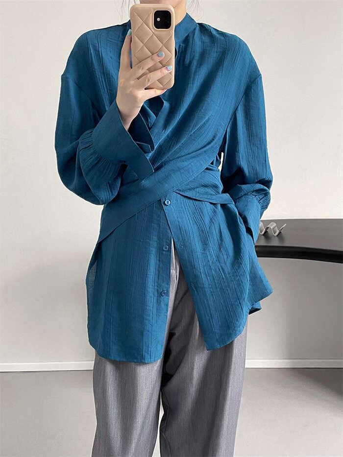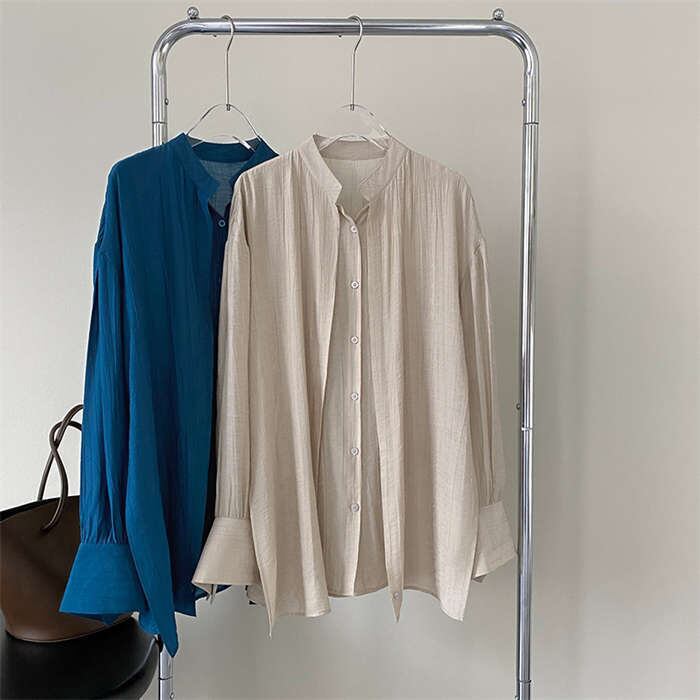 2色カラバリ、スタンドカラーデザイン長袖シャツブラウス。