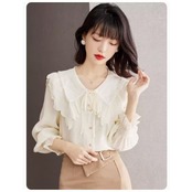 トップス レディース フリルブラウス プルオーバー シフォン 長袖 襟付き 2重フリル襟 リボン 大人可愛い きれいめ 大人 上品 おしゃれ お洒落 レトロ 存在感 大人女子 ガーリー キュート ラブリー こなれ感 抜け感 S M L XL ベージュ 無地 春 夏 秋 10代 20代 30代 40代 50代 60代 オフィス ビジネス OL 通勤 通学 学生 休日 女子会 デート お出かけ 旅行 普段使い デイリー モテ 韓国 オルチャン ママ 重ね着 着回し ファッション コーデ スタイル