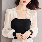 黒チューブトップにアイボリーのシフォン袖の透け感が