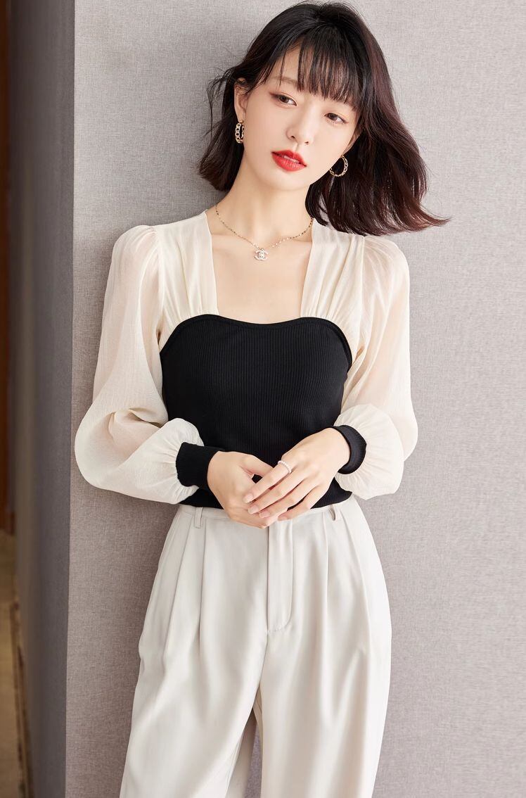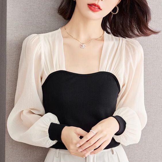 トップス レディース シフォンブラウス ドッキングカットソー 切り替えデザイン 長袖 シフォン袖 ボリューム袖 シースルー袖 透け感 プルオーバー 襟なし 大人可愛い シンプル 上品 大人 おしゃれ お洒落 かっこいい レトロ こなれ感 クール 存在感 抜け感 S M L XL アイボリー 白 ブラック 黒 グレー 無地 春 夏 秋 10代 20代 30代 40代 50代 デート お出かけ 女子会 休日 旅行 普段使い デイリー リゾート 韓国 オルチャン プレゼント ギフト ファッション コーデ